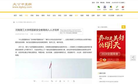 4月15日,河南理工大学国家安全教研室“国家安全教育”公开课开讲了,为全校师生上了一堂生动的国家安全教育大课。学校积极响应国家安全教育日的号召,动员师生通过开展主题班会、专题讲座、知识竞赛、主题宣传展等方式,营造良好的氛围。连日来,光明日报客户端、中国教育报客户端、《中国煤炭报》、河南日报客户端等13家媒体进行了宣传报道,引发热烈反响具体内容如下: