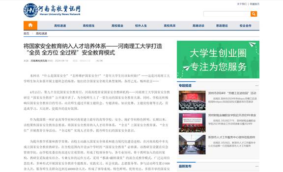 作为我国第一所矿业高等学府和河南省建立最早的高等学校,安全、地矿学科特色鲜明,长期以来,该校聚焦国家安全教育总要求,将国家安全教育纳入人才培养体系,“全员”上国家安全教育课、“全方位”开展教育引导活动、“全过程”实现人才培养,提升师生们的国家安全意识。