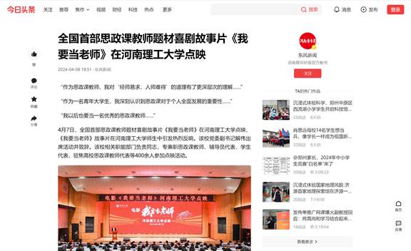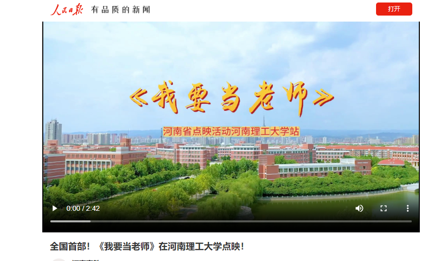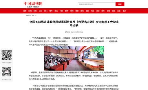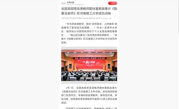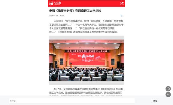 4月7日,全国首部思政课教师题材喜剧故事片《我要当老师》在河南理工大学点映,该影片在学校师生中引发热烈反响。连日来,光明日报客户端、中国青年报客户端、河南日报客户端等17家媒体进行了宣传报道,具体内容如下: