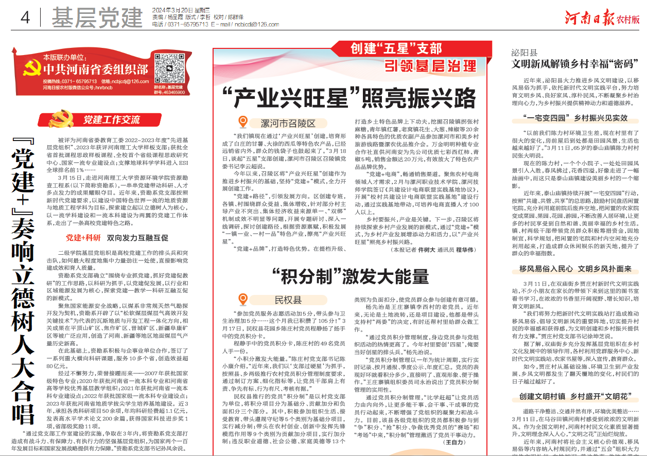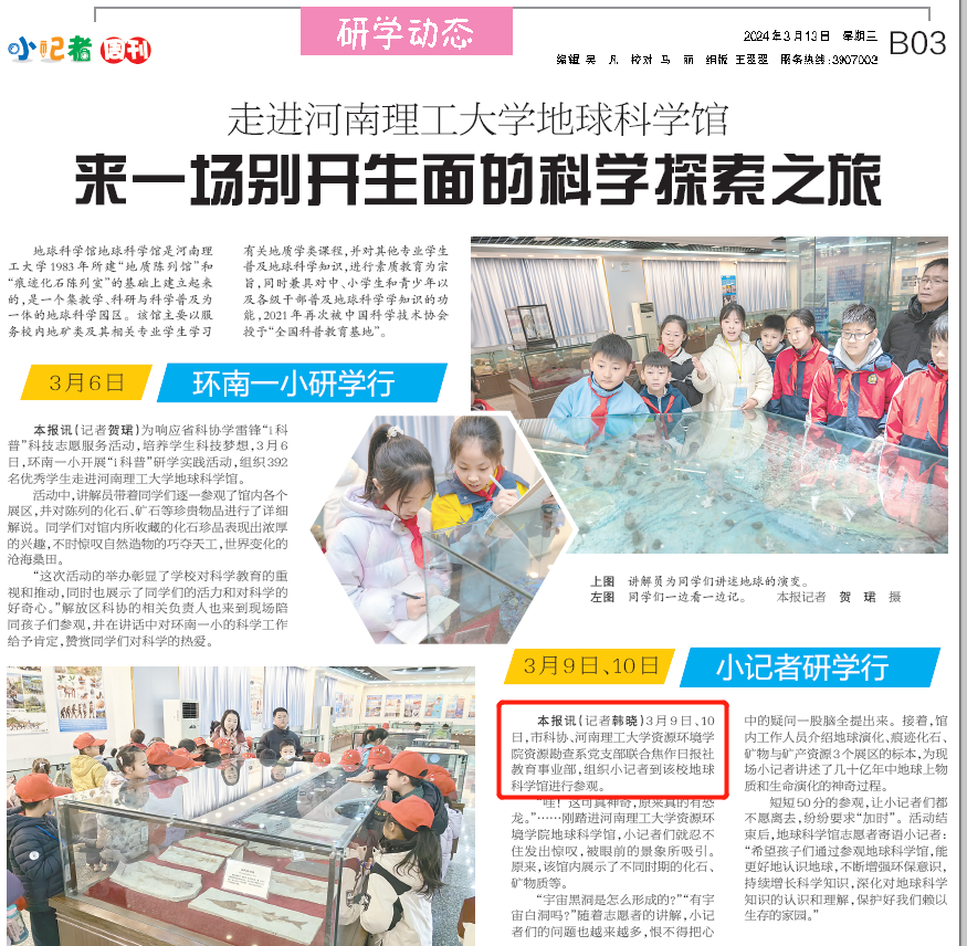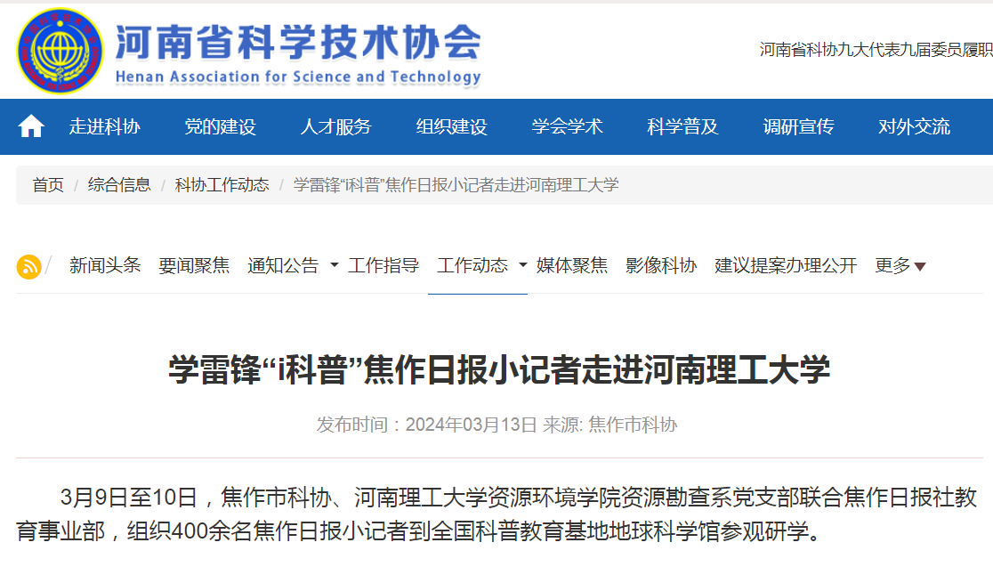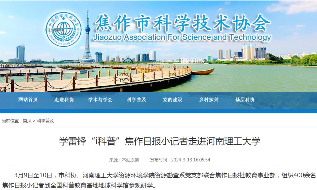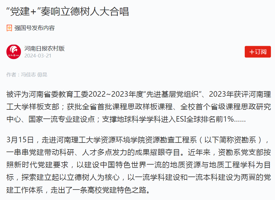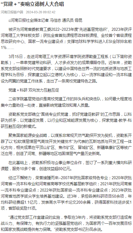 资环学院资勘系党支部按照新时代党建要求,以建设中国特色世界一流的地质资源与地质工程学科为目标,探索建立起以立德树人为核心,以一流学科建设和一流本科建设为两翼的党建工作体系,走出了一条“‘党建+’奏响立德树人”高校党建特色之路。连日来,受到河南日报客户端、”学习强国”学习平台、河南日报农村版等主流媒体广泛报道,党支部三级联创相关活动受到河南省科学技术协会、焦作市科学技术协会等媒体报道,引发热烈反响。相关内容如下: