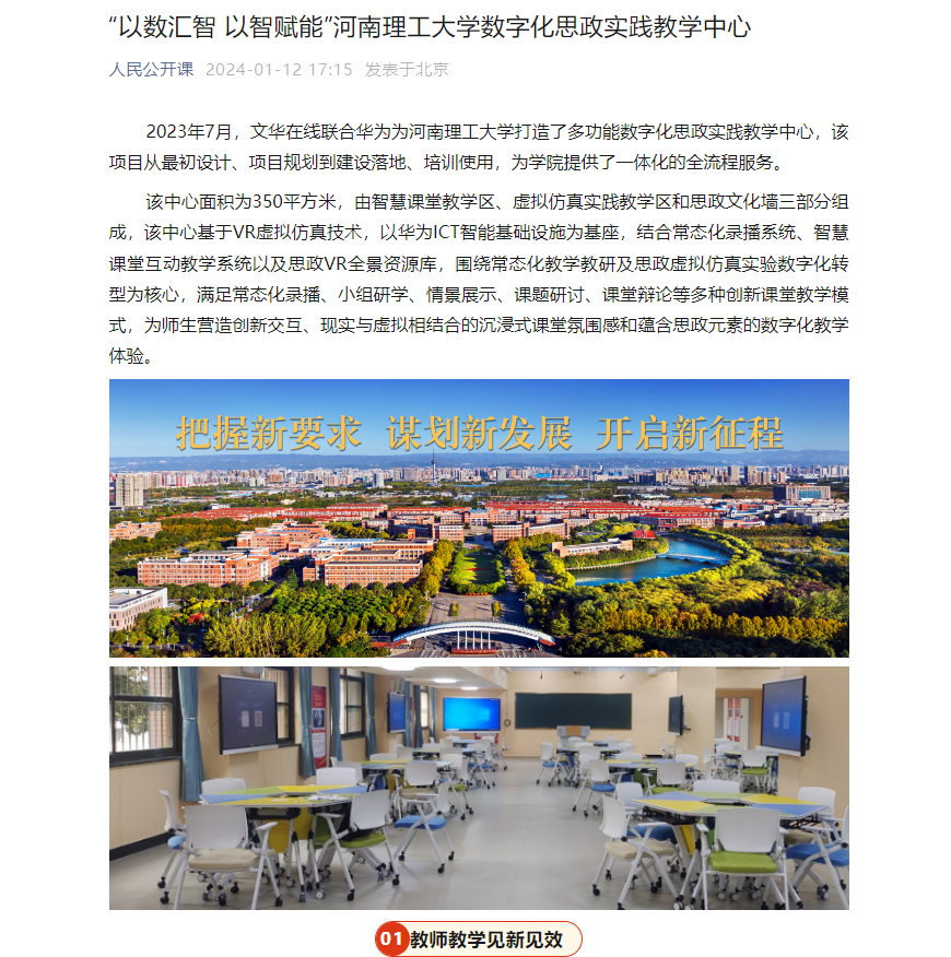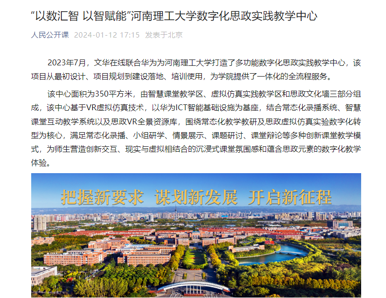 2023年7月,文华在线联合华为为河南理工大学打造了多功能数字化思政实践教学中心,该项目从最初设计、项目规划到建设落地、培训使用,为马克思主义学院提供了一体化的全流程服务。连日来,人民公开课客户端、大河网等媒体进行了报道,相关内容如下: