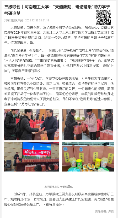 12月18日,土木工程学院力学系教工党支部开展考研慰问活动,给每一位努力拼搏、坚持不懈的考研学子加油打气,传递温暖与力量。12月28日河南日报客户端对此进行了报道,具体内容如下: