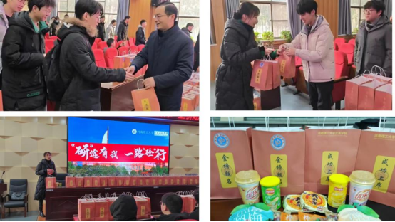 “研”途漫漫,有爱相伴。一份份印有“金榜题名”、“成功上岸”的精美“考研能量包”送至考研学子手中。每一份能量包里都有寓意好“柿”发“生”的柿饼花生、“六六大顺”的溜溜梅、“百事百顺”的乐事薯片、“考运旺旺”的旺仔牛奶,这些寓意美好的礼物一定能给同学们带来好运,让他们在考试中顺利发挥,成功上岸,考取自己理想的学校。