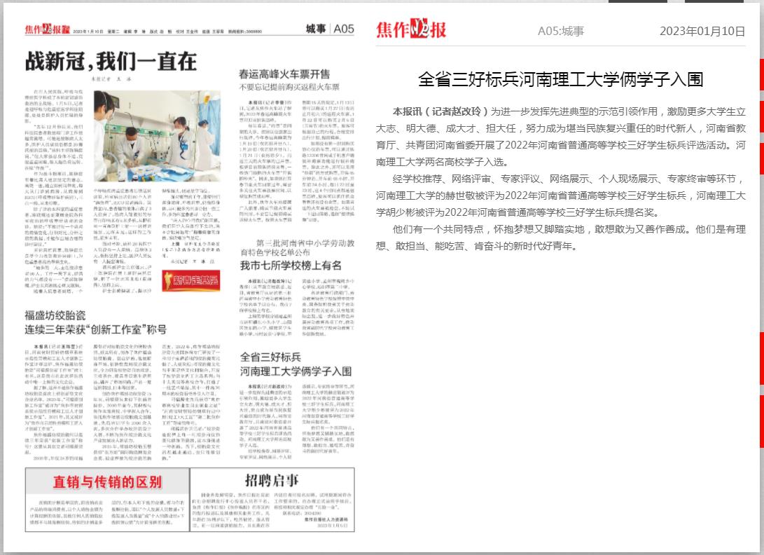 经学校推荐、网络评审、专家评议、网络展示、个人现场展示、专家终审等环节,河南理工大学的赫世敬被评为2022年河南省普通高等学校三好学生标兵,河南理工大学胡少彬被评为2022年河南省普通高等学校三好学生标兵提名奖。