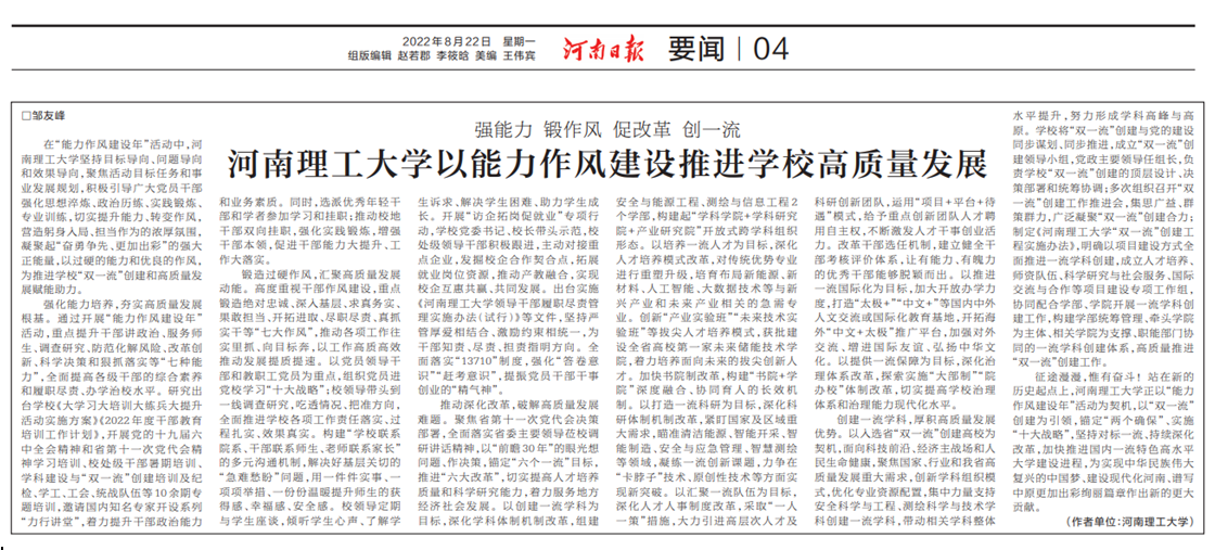 在“能力作风建设年”活动中,河南理工大学坚持目标导向、问题导向和效果导向,聚焦活动目标任务和事业发展规划,积极引导广大党员干部强化思想淬炼、政治历练、实践锻炼、专业训练,切实提升能力、转变作风,营造躬身入局、担当作为的浓厚氛围,凝聚起“奋勇争先、更加出彩”的强大正能量,以过硬的能力和优良的作风,为推进学校“双一流”创建和高质量发展赋能助力。