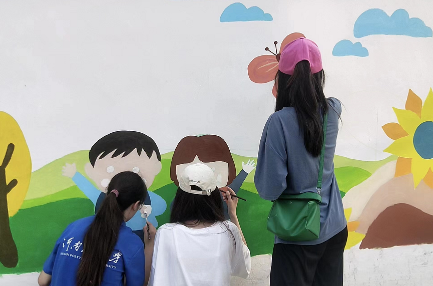 实践队员专业优势明显,经过前期现场调研与设计,队员们在指导教师的精心安排下,主要围绕三大主题开始了具体的墙绘任务。