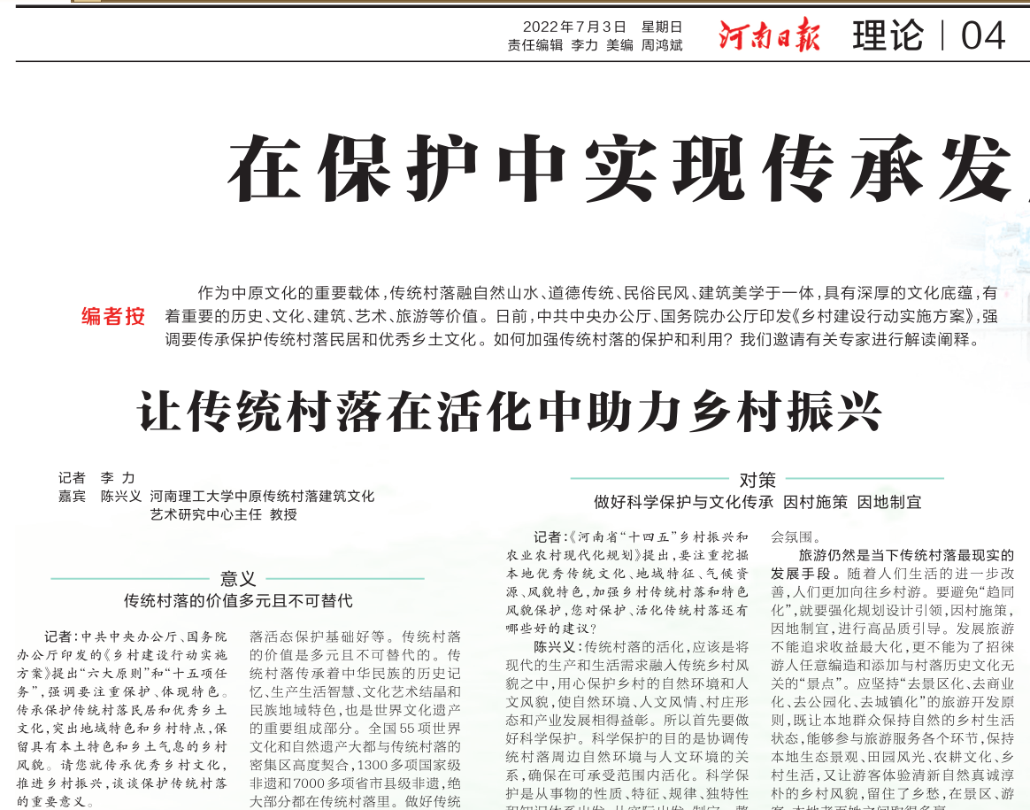 记 者:《河南省“十四五”乡村振兴和农业农村现代化规划》提出,要注重挖掘本地优秀传统文化、地域特征、气候资源、风貌特色,加强乡村传统村落和特色风貌保护,您对保护、活化传统村落还有哪些好的建议?
