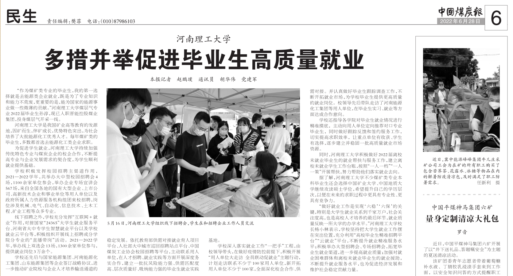 为促进学生就业,河南理工大学持续加强传统特色专业与煤炭企业的校企合作,不断提高专业与企业发展需求的契合度,为学生顺利就业提供基础。