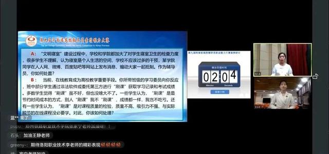 基础知识测试环节,辅导员“云端”考试,在线答题,学生们线上实时监考老师,在直播间为老师呐喊助威;案例研讨环节,案例紧扣辅导员日常工作领域,打破了以往单向性、程式化的比赛方式,将示范性、互动性、差异性和引领性融入研讨;谈心谈话环节,结合疫情防控、网络诈骗等现实问题,聚焦寝室矛盾、学业帮扶等实际问题,老师与学生你来我往,开展了心贴心的交流和探讨,提出了实打实的举措和见解。