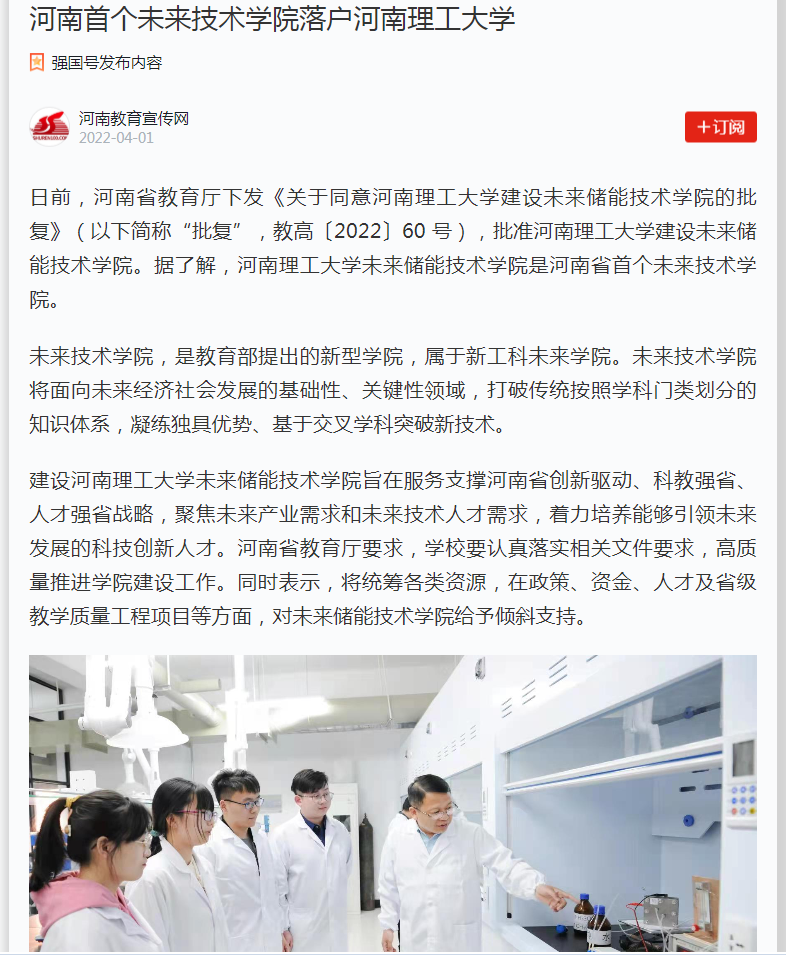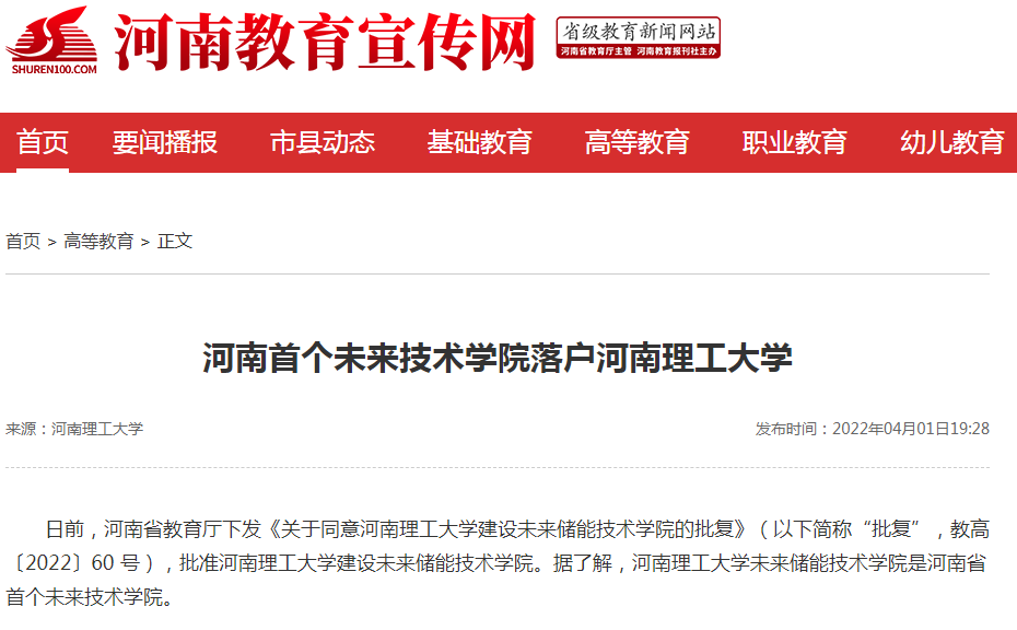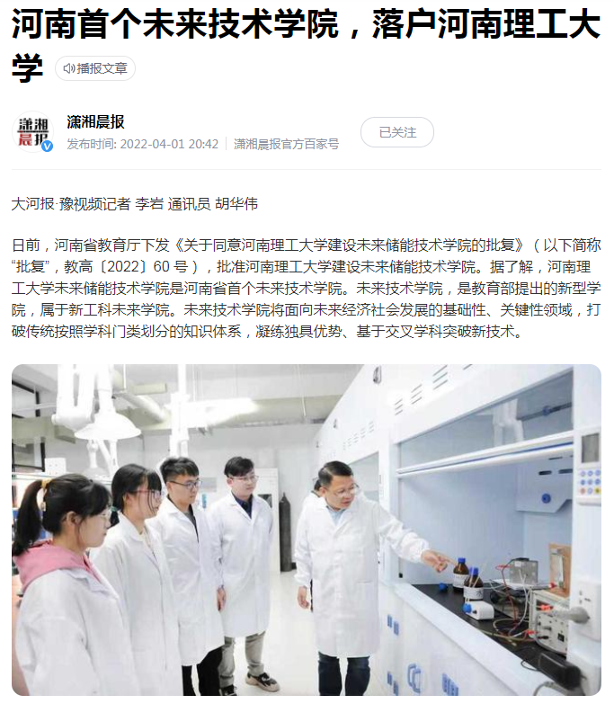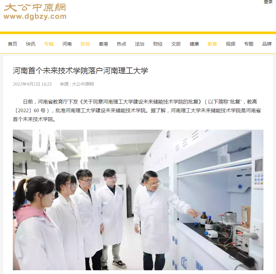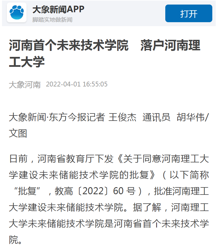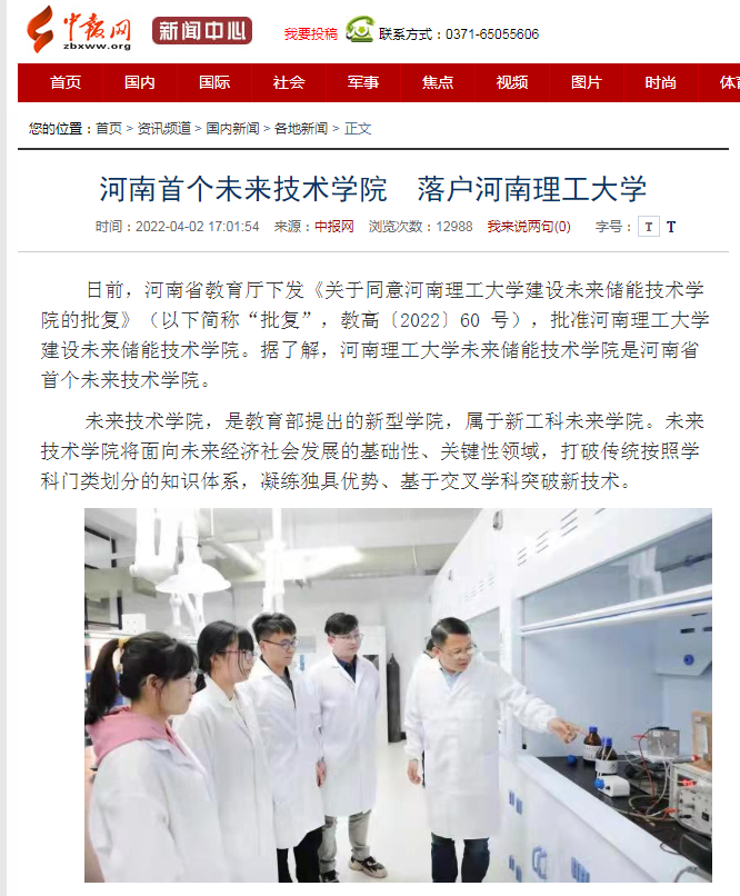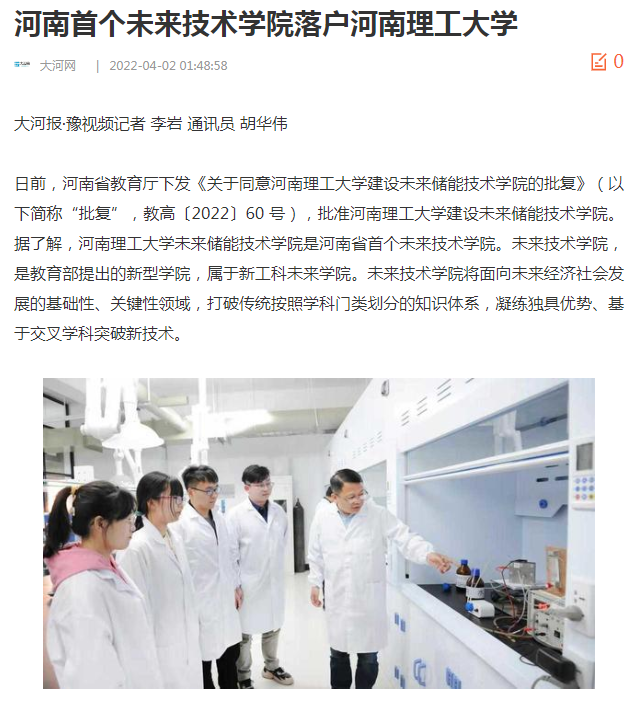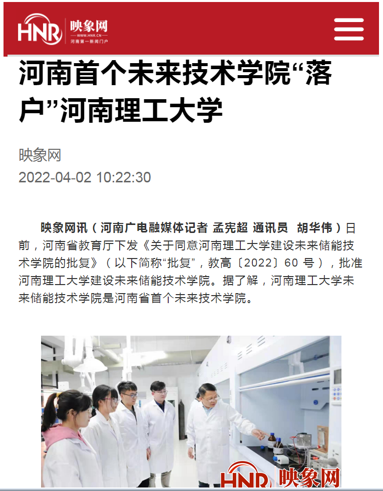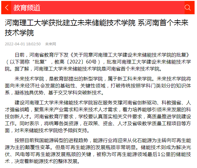 日前,河南省教育厅下发《关于同意河南理工大学建设未来储能技术学院的批复》(以下简称“批复”,教高〔2022〕60 号),批准河南理工大学建设未来储能技术学院,这是河南省首个未来技术学院。光明日报客户端、中国教育新闻网、中国科技网、河南日报客户端、中新网、大河网、大公中原网、未来网、大象河南等社会主流媒体纷纷予以报道。
