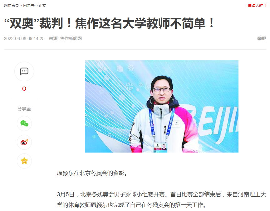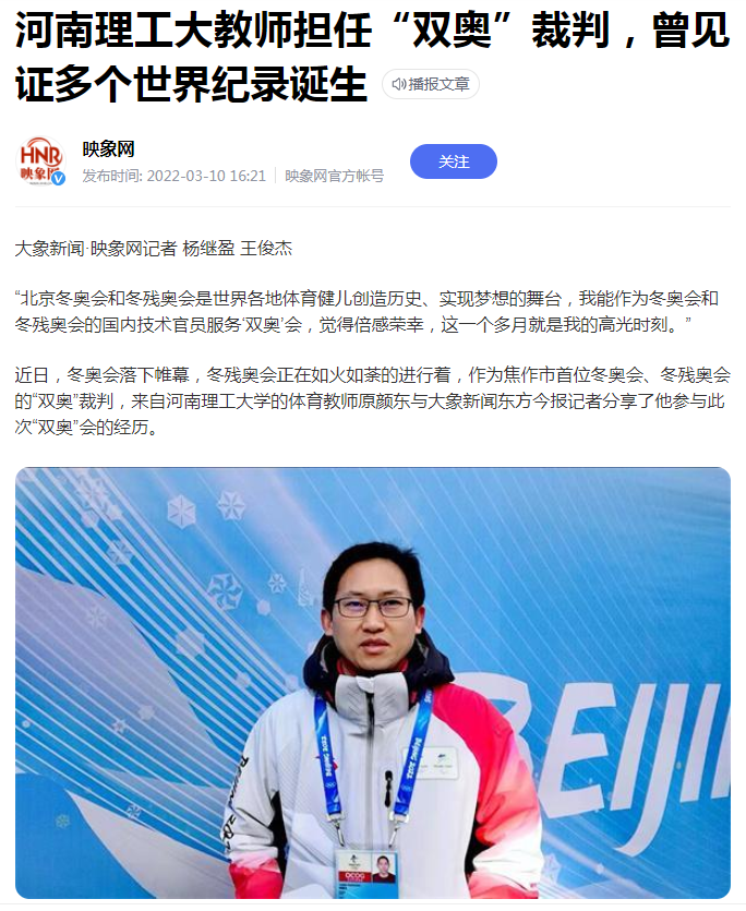 近日,冬奥会落下帷幕,冬残奥会正在如火如荼的进行着,作为焦作市首位冬奥会、冬残奥会的“双奥”裁判,来自河南理工大学的体育教师原颜东与大象新闻东方今报记者分享了他参与此次“双奥”会的经历。