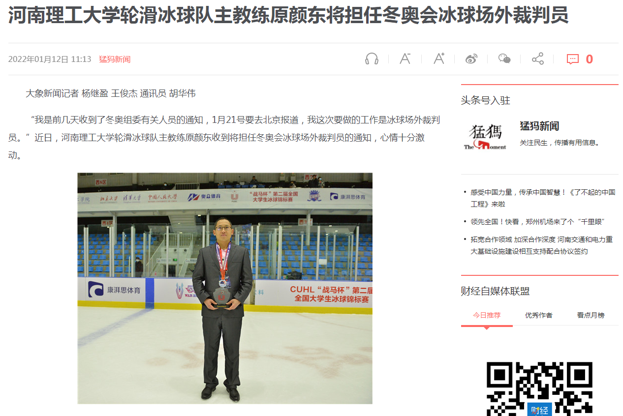 河南理工大学轮滑冰球队主教练原颜东将担任冬奥会冰球场外裁判员