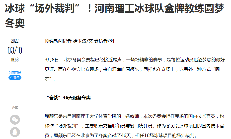 2019年北京冬奥组委面向全国招募冰球项目国内技术官员,原颜东报名并通过资格审查后,进行了为期三年的理论培训和实践,同时,还有英语学习和考核,历经种种考验,总算梦圆冬奥运。