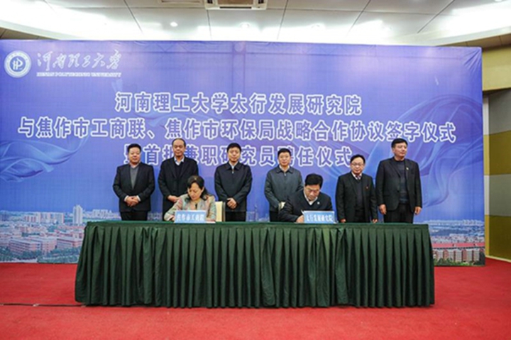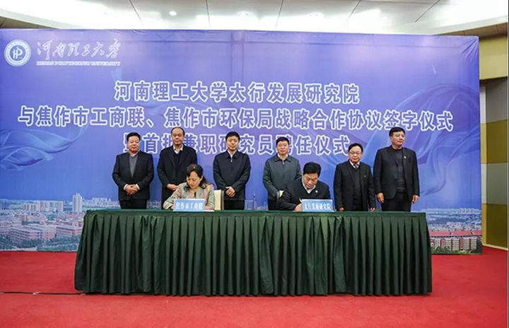 12月18日,河南理工大学太行发展研究院与焦作市工商联、环保局战略合作协议签字仪式暨首批兼职研究员聘任仪式在河南理工大学举行。