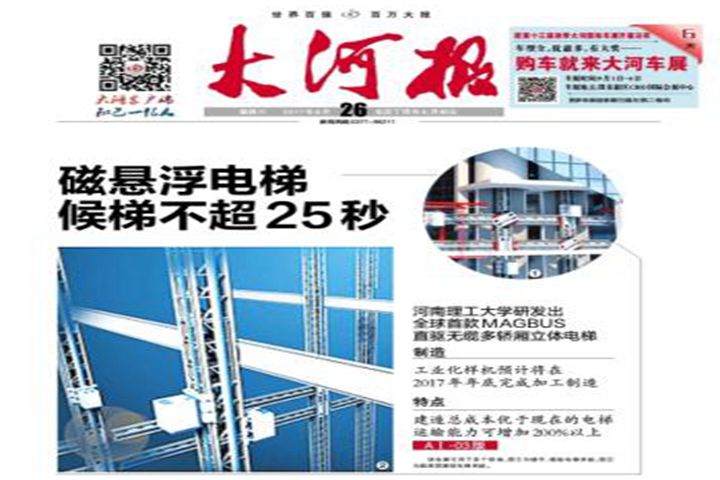 《大河报》2017年8月26日头版、第AⅠ·3版以《河南理工大学研发出全球领先的磁悬浮电梯,可用于多个领域,明年或许就能乘磁悬浮电梯了》为题并配发图片;《焦作日报》2017年8月26日第1版报眼以《全球首款无缆多轿厢立体电梯在我市研发成功,今年年底完成加工制造,明年上半年试运行》为题;人民网2017年8月28日以《河南理工大学发布全球首个无缆多轿厢立体电梯技术》为题;大河网2017年8月25日以《全球首款!河南一高校研发出无缆多轿厢立体电梯》为题,报道了我校发布的具有完全自主知识产权的全球首款MAGBUS-直驱无缆多轿厢立体电梯。新浪网等予以转载。相关内容如下: