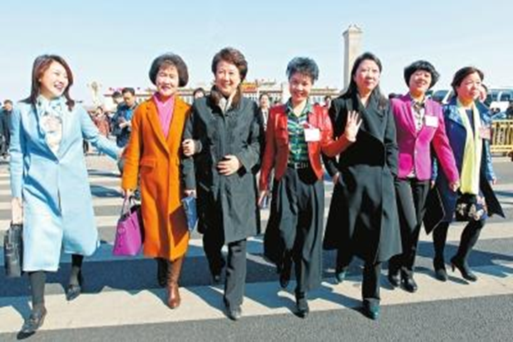当天是三八妇女节,7位女代表互致节日的问候,然后手挽手走向会场。她们自信优雅的气质,一时吸引不少人的目光。
