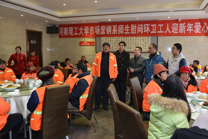 新年到来之际,环卫工人的工作量骤增,加上严冬寒流和雾霾天气频繁出现,其工作环境愈发恶劣。河南理工大学师生看在眼里记在心里,为表达对环卫工人的感谢,该校工商学院市场营销系2014级学生开展了针对环卫工人的“爱心暖冬工程”,邀请40名一线环卫工人在焦作市大蓉和饭店举行迎新年茶话会,举办茶话会所用的资金则来自大学生们课程实践中获得的收益。