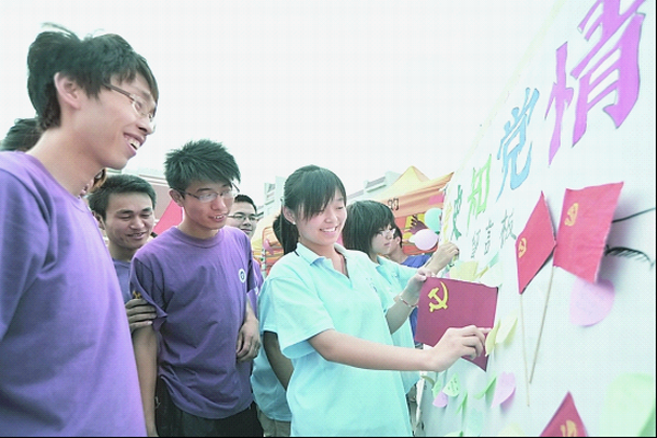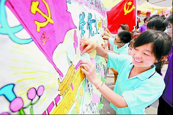 6月24日,河南理工大学的学生们正在“许愿墙”上粘贴对党的生日的祝福。当日,该校材料学院社会实践小组开展了“学党史 知党情 跟党走”活动。同学们通过党史知识竞答、许愿墙、万人签名等形式,庆祝中国共产党成立90周年。(赵林峰 摄)