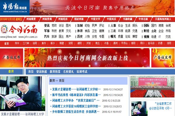 11月中旬,《河南教育》以《发展才是硬道理——访河南理工大学校长邹友峰教授》为题,报道校长邹友峰教授对全省教育工作会议的召开、《教育规划纲要》的颁布和高等教育发展的深刻理解。《人民日报》第一子报《市场报》网络版在头条位置并配发图片予以转载。相关内容如下: