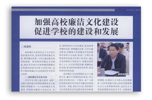 5月中旬,《河南教育》以《加强高校廉洁文化建设 促进学校的建设和发展》为题并配发图片,报道校党委副书记兼纪委书记张国臣对加强高校廉洁文化建设,促进学校建设和发展的深刻理解。相关内容如下: