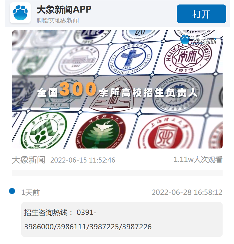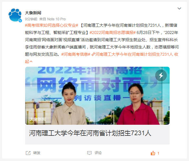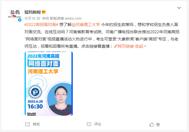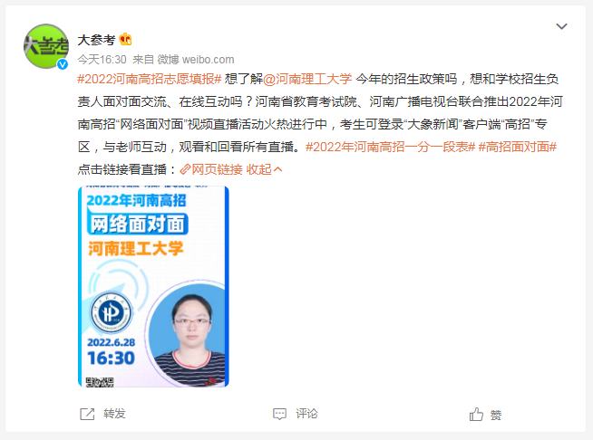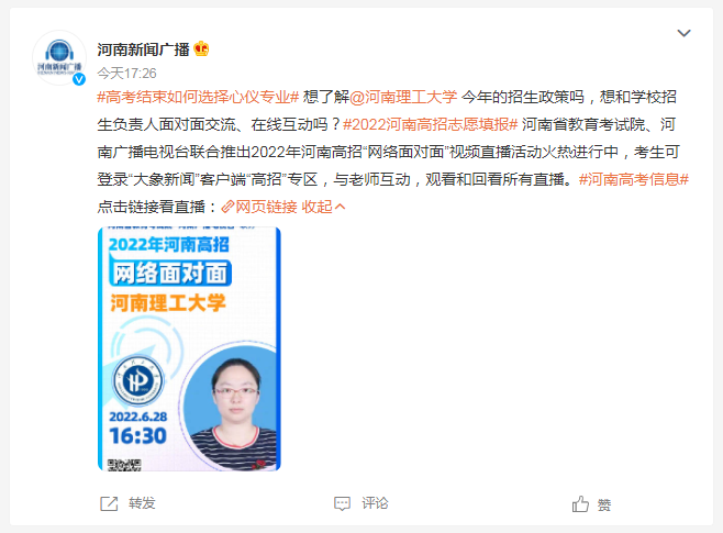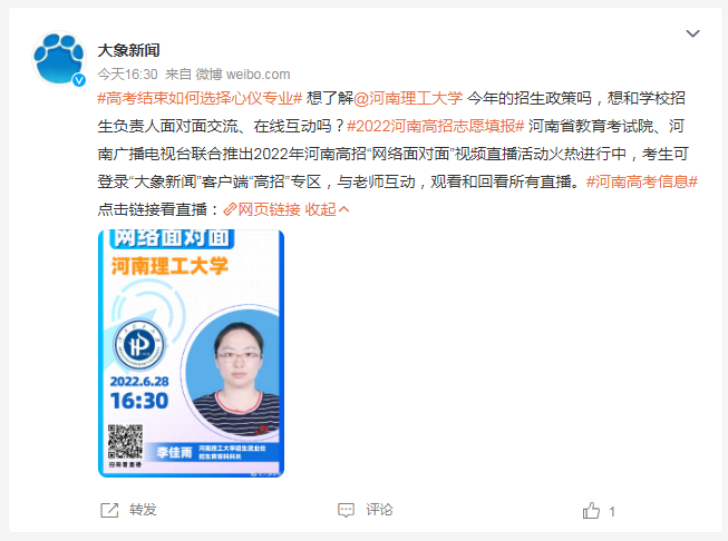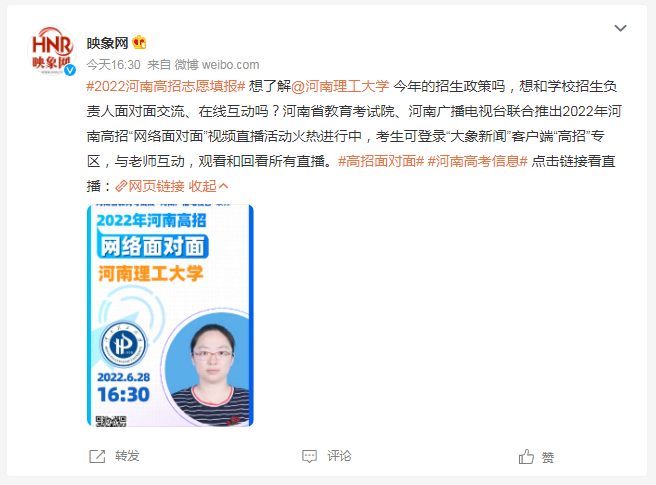 #高考结束如何选择心仪专业# 想了解@河南理工大学 今年的招生政策吗,想和学校招生负责人面对面交流、在线互动吗?#2022河南高招志愿填报# 河南省教育考试院、河南广播电视台联合推出2022年河南高招“网络面对面”视频直播活动火热进行中,考生可登录“大象新闻”客户端“高招”专区,与老师互动,观看和回看所有直播。#河南高考信息#