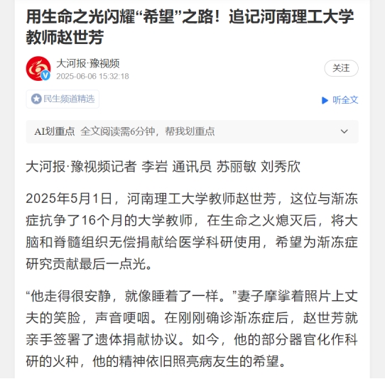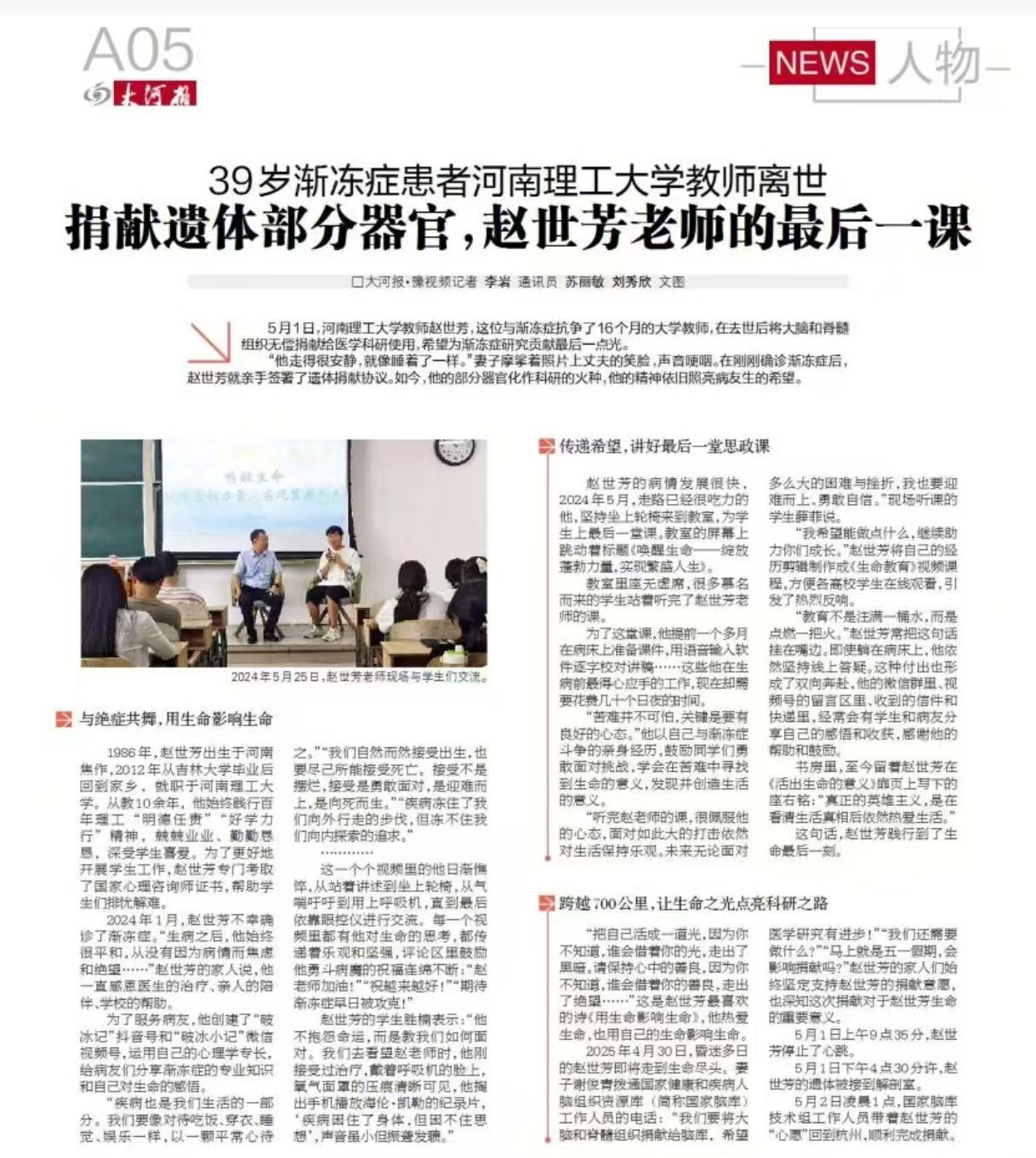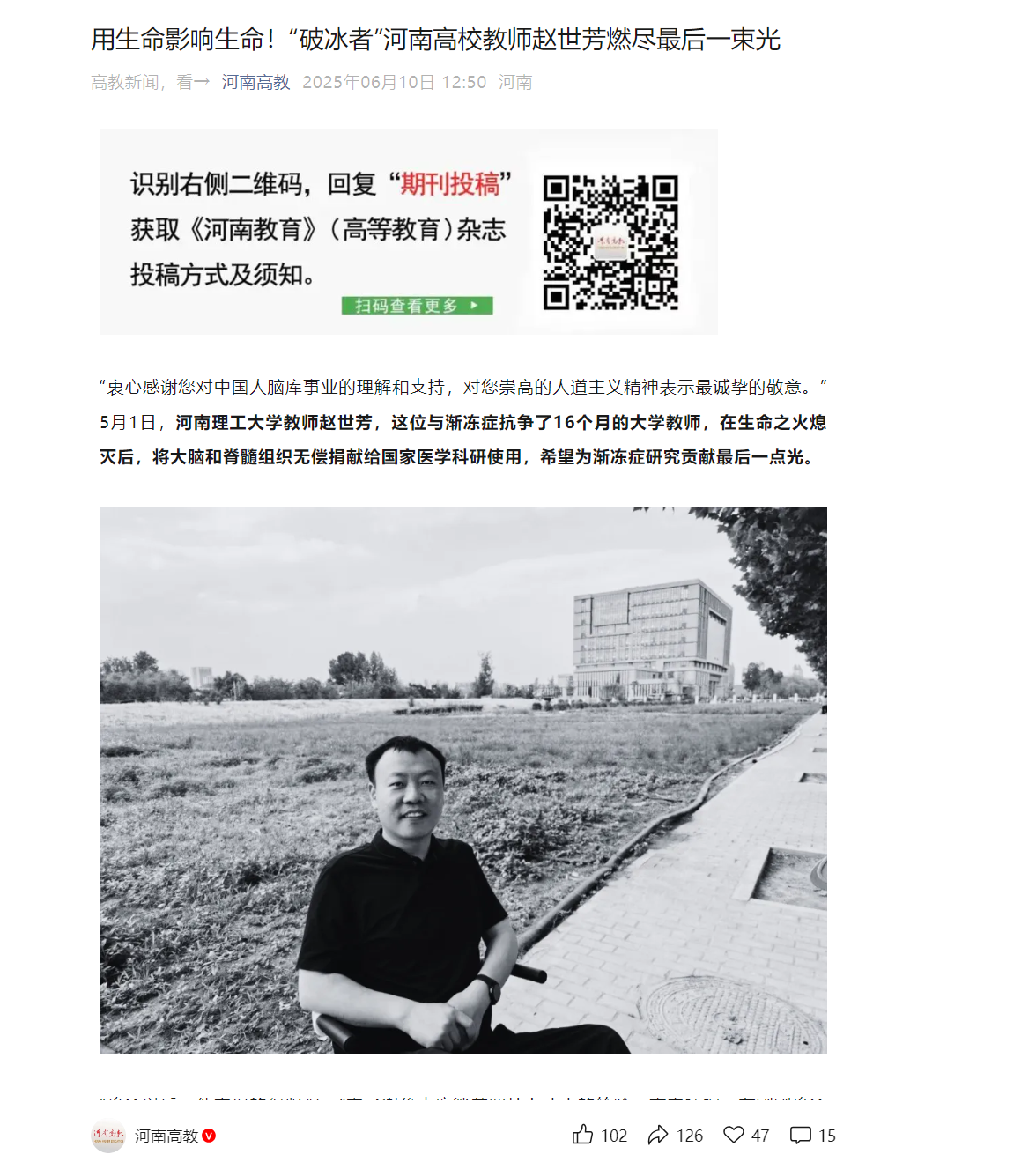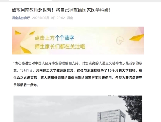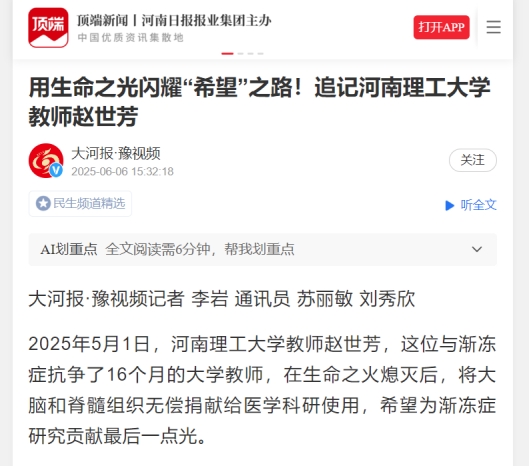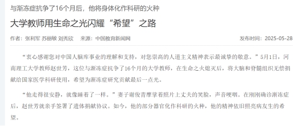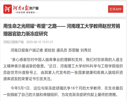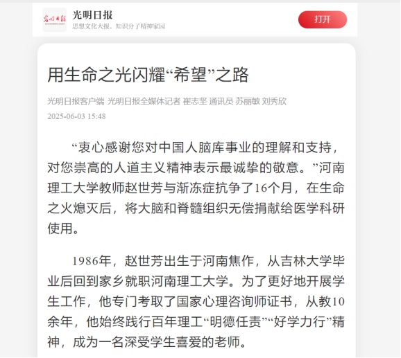 河南理工大学教师赵世芳,这位与渐冻症抗争了16个月的大学教师,在生命之火熄灭后,将大脑和脊髓组织无偿捐献给国家医学科研使用,希望为渐冻症研究贡献最后一点光。连日来,光明日报客户端、中国教育新闻网、河南日报、大河报等媒体进行了宣传报道,相关内容如下: