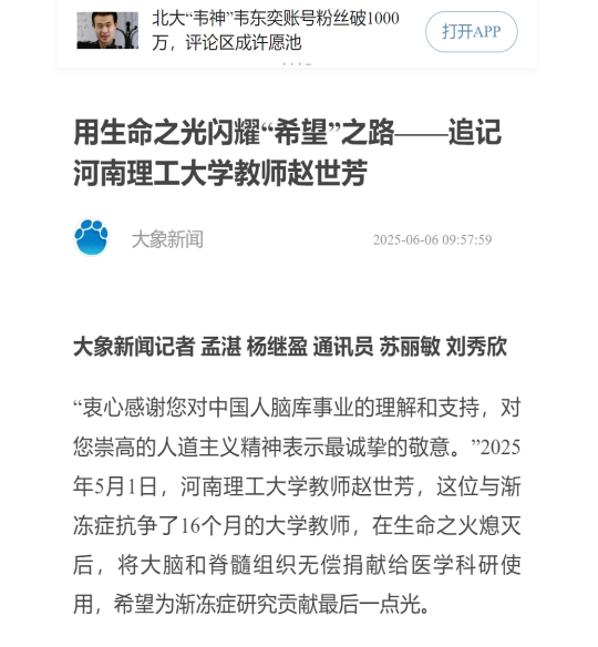 “衷心感谢您对中国人脑库事业的理解和支持,对您崇高的人道主义精神表示最诚挚的敬意。”河南理工大学教师赵世芳与渐冻症抗争了16个月,在生命之火熄灭后,将大脑和脊髓组织无偿捐献给医学科研使用。