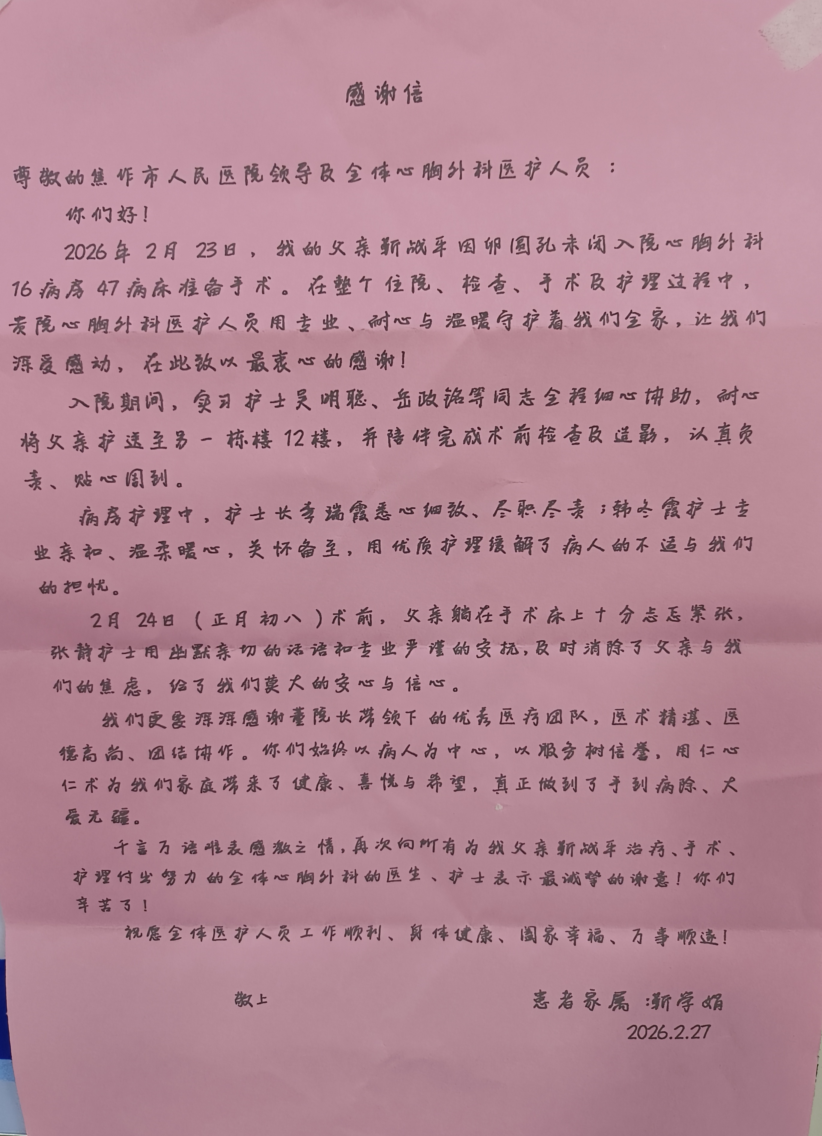 日前,从焦作市人民医院获悉,我校2024级护理专业学生吴明聪、岳政铭在心胸外科实习期间收到患者家属的书面表扬。