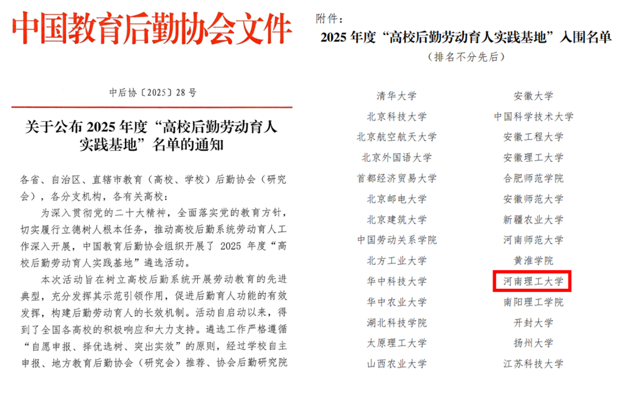 近日,中国教育后勤协会开展的2025年度“高校后勤劳动育人实践基地遴选活动”公布评选结果,学校获评2025年度“高校后勤劳动育人实践基地”。