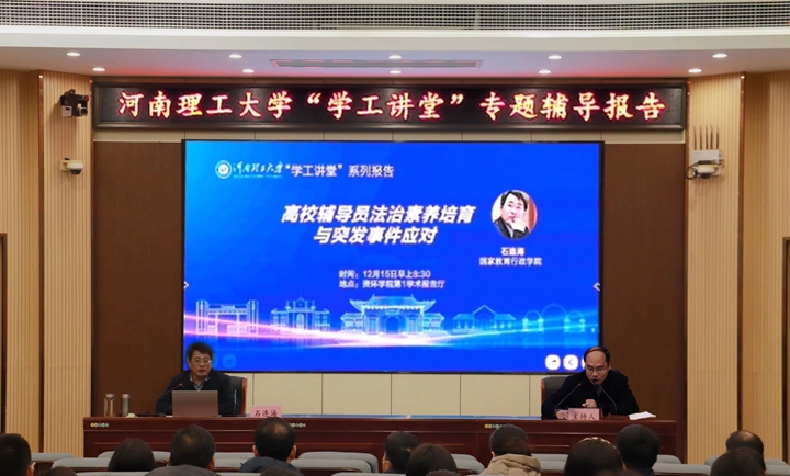 12月15日上午,国家教育行政学院副研究员、西南大学教育法学博士、中国教育科学研究院博士后石连海受学校邀请,在资环学院第Ⅰ学术报告厅举办“学工讲堂”首场专题辅导报告。