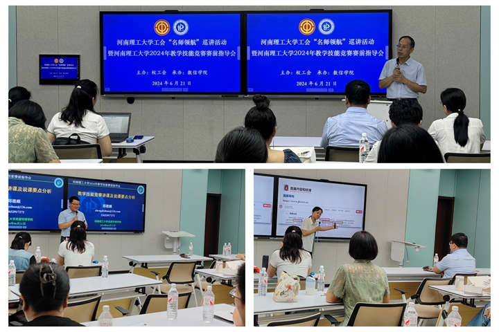 为进一步提升我校2024年度全省教学技能竞赛参赛教师的教学素养和竞赛水平,更好发挥名师示范带动作用,6月21日下午,学校在三号教学楼3208智慧教室举行“名师领航”巡讲活动暨2024年教学技能竞赛赛前指导会。