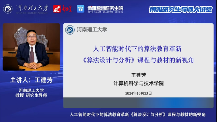 10月23日晚,计算机学院研究生导师王建芳教授受超星集团邀请做客博雅研究生导师大讲堂,通过线上直播的方式,为全国研究生带来了一场题为“人工智能时代下的算法教育革新-《算法设计与分析》课程与教材的新视角”的精彩报告。