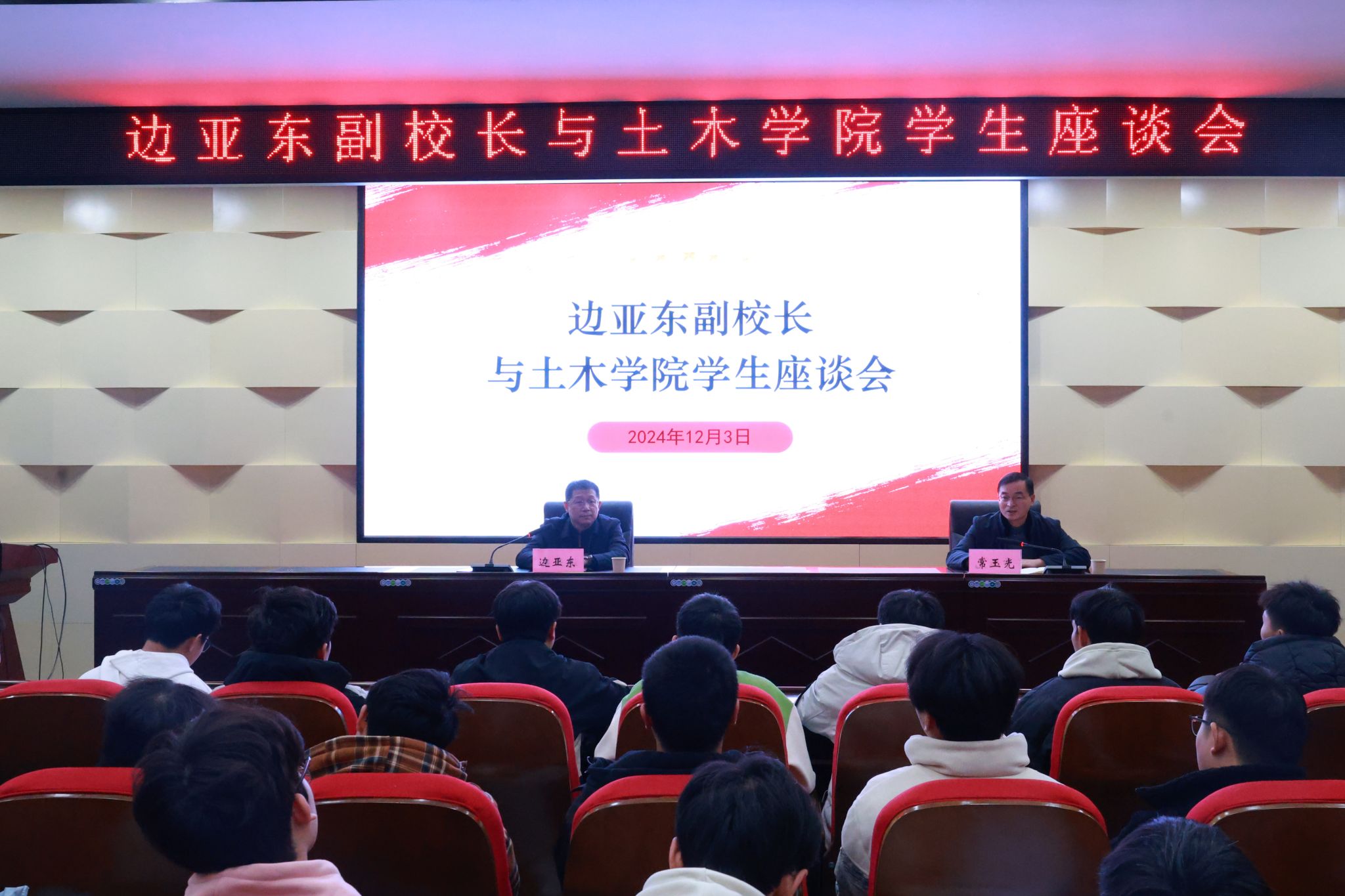 12月3日下午,副校长边亚东在土木学院会议室与城市地下空间工程2203班全体学生、研究生代表及新进青年教师代表座谈交流。