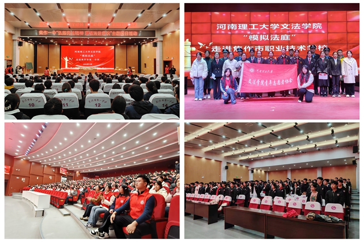 文法学院先后走进焦作市第一中学、焦作市职业技术学校举办了第六场、第七场“模拟法庭”进校园活动。文法学院、焦作市第一中学、焦作市职业技术学校相关领导和负责人,以及文法学院青年志愿者协会成员、焦作市第一中学全体入团积极分子及焦作市职业技术学校全体学生会成员共400余人参加活动。