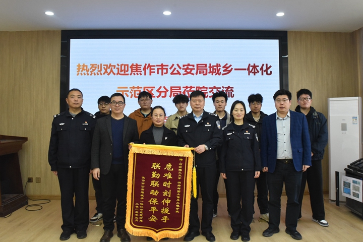 4月1日上午,焦作市公安局高新分局政委郭景川、副局长李曼、纪委书记苗瑞轩一行专程来到测绘学院,代表分局向学院赠送“危难时刻伸援手,联勤联动保平安”的锦旗,以感谢测绘学院在北山灭火救援中的突出贡献。