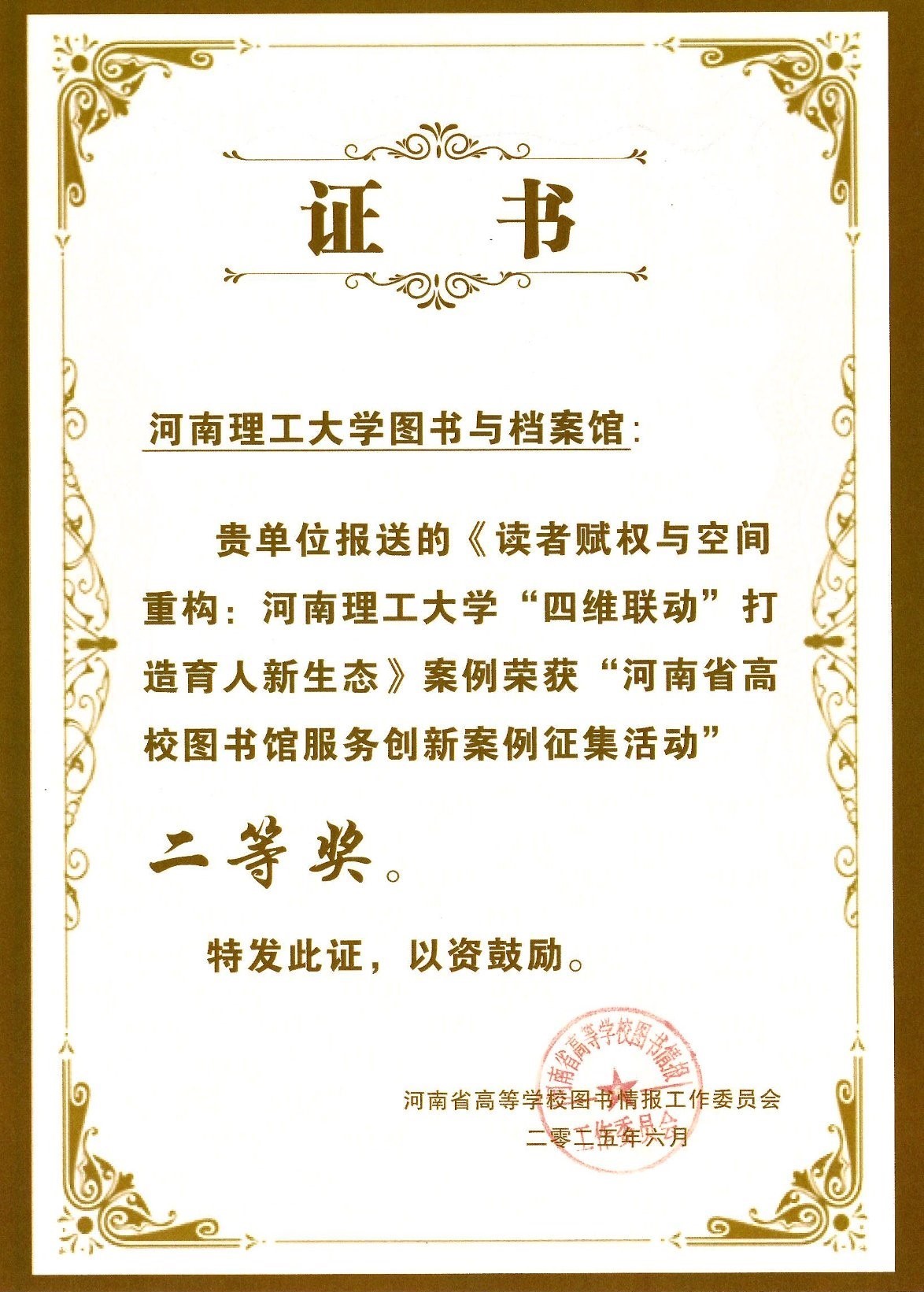 图书与档案馆申报的《朱训书屋“四维协同”阅读推广体系构建》《读者赋权与空间重构:河南理工大学“四维联动”打造育人新生态》两项案例脱颖而出,分别荣获一等奖、二等奖。