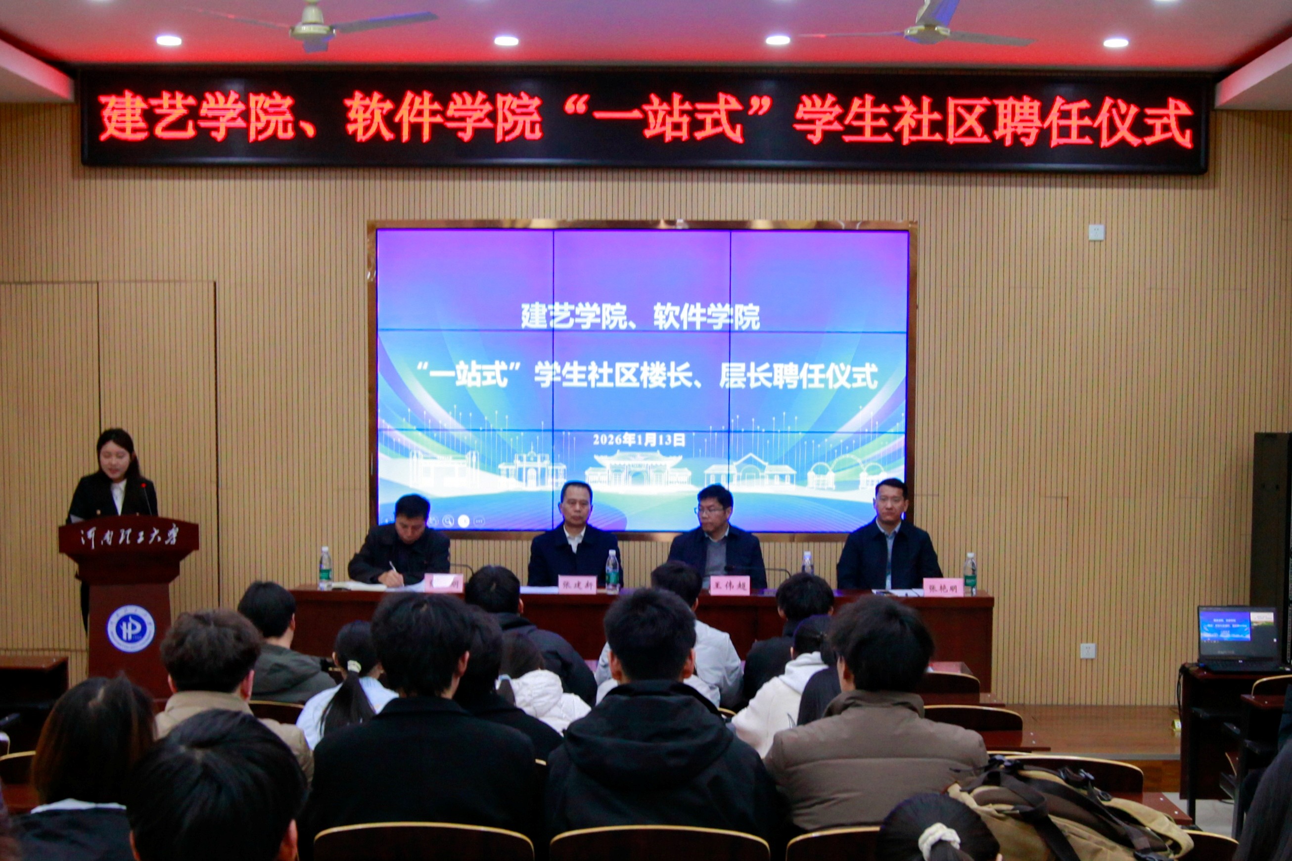 1月13日,建艺学院、软件学院“一站式”学生社区楼长、层长聘任仪式在北校区学术报告厅举行。
