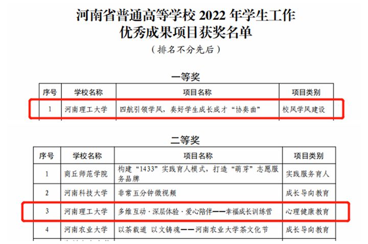 近日,由河南省委教育工委、河南省教育厅组织的2022年普通高等学校学生工作优秀成果项目评选落下帷幕,我校学生工作部(处)遴选推荐的两个项目脱颖而出,分别荣获一等奖和二等奖。