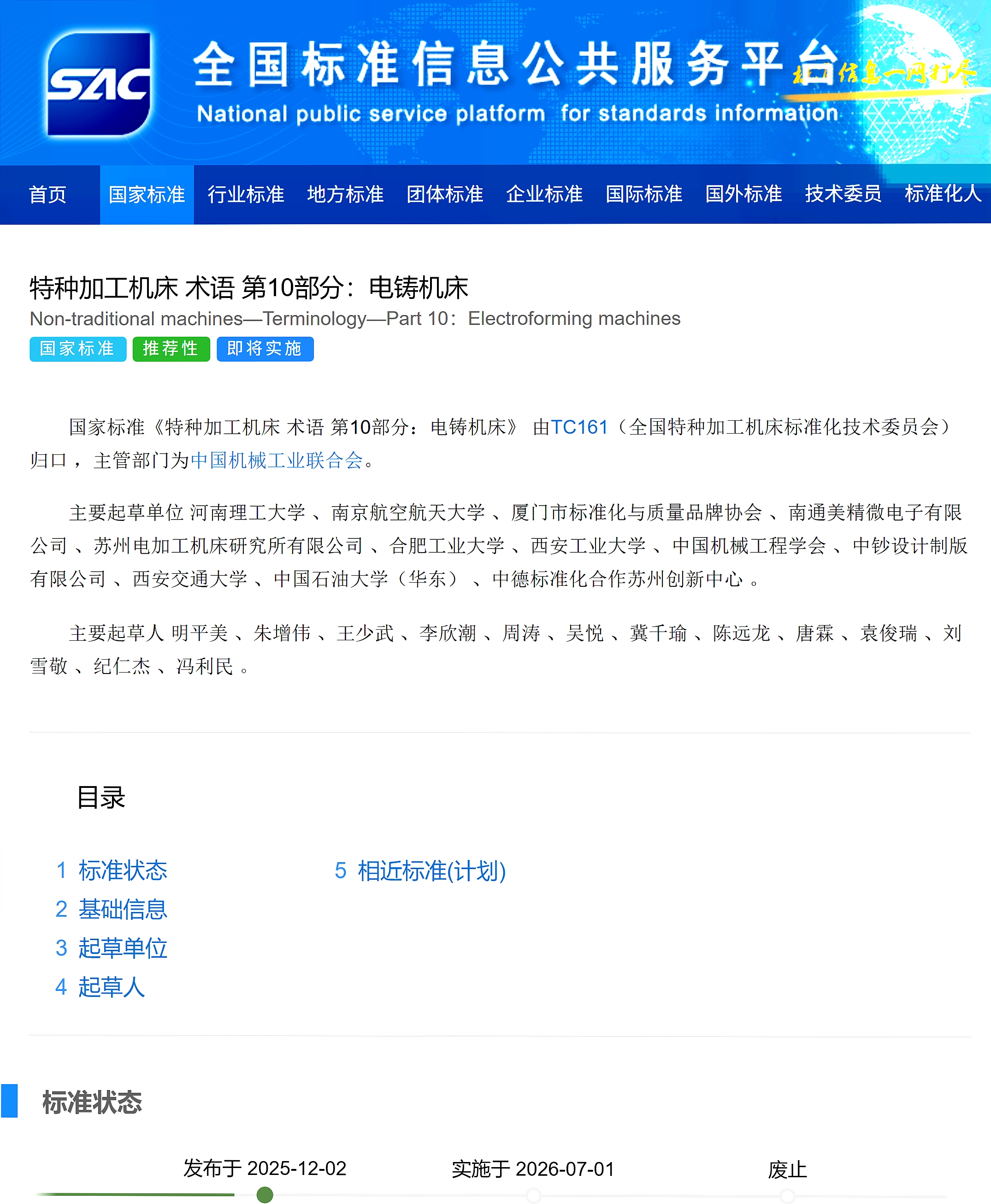 12月2日,国家市场监督管理总局、国家标准化管理委员会发布了国家标准《特种加工机床术语第10部分:电铸机床》(GB/T14896.10-2025)。