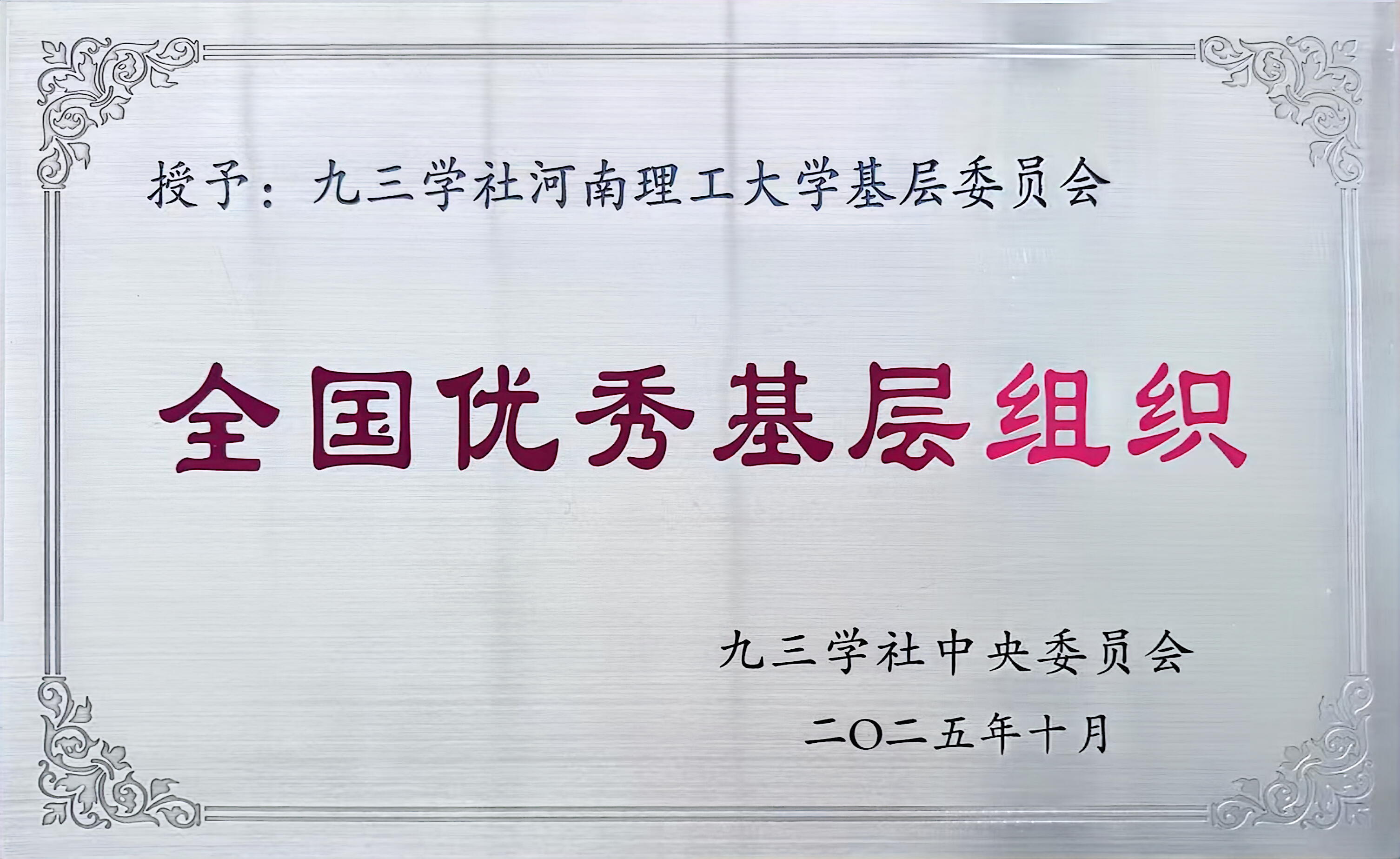 近日,九三学社中央印发《九三学社中央关于表彰全国优秀社员、全国优秀社务工作者、全国优秀省级组织和全国优秀基层组织的决定》,九三学社河南理工大学基层委员会荣获“全国优秀基层组织”称号,社员张盛荣获“全国优秀社员”称号。