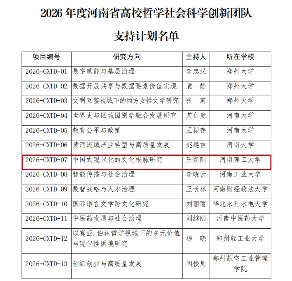 11月3日,河南省教育厅发文公布2026年度河南省高等学校哲学社会科学创新团队支持计划名单,由马克思主义学院王新刚教授担任首席专家的“中国式现代化的文化根脉研究”创新团队成功获批,为马克思主义学院第4个河南省高校哲学社会科学创新团队。