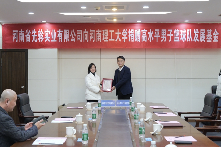 本网讯 寒冬时节,却亦有暖。1月11日下午,河南省先轸实业有限公司向学校捐赠高水平男子篮球队发展基金,学校在行政楼一楼会议室举行捐赠仪式。副校长李振华、河南省先轸实业有限公司董事长崔明亮出席仪式。仪式由体育学院党委副书记马志洋主持。