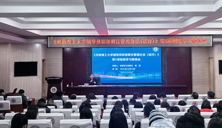 本网讯(通讯员 赵琨 王文萍)为使学工队伍全面、准确理解、领会学校新制(修)订的《辅导员职级聘任管理办法》和《辅导员队伍建设管理规定》《辅导员考评办法》《班主任队伍建设管理规定》《班主任考评办法》等5项制度相关内容、要求,进一步调动、激发学工队伍工作活力,12月12日下午,学校党委学工部在机械学院205会议室召开学校《辅导员职级聘任管理办法》等5项制度学习解读会。校学工部部长陈昊为学校辅导员解读了《辅导员职级聘任管理办法》等5项制度,学校全体辅导员参加了学习解读会。