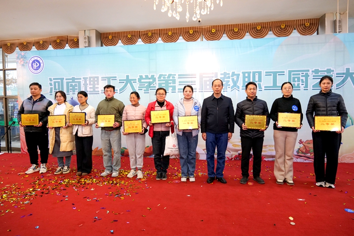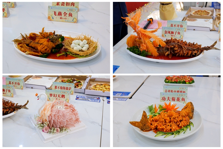 比赛开始,队员们换上厨师围裙,戴上厨师帽,瞬间化身为技艺精湛的大厨,各参赛队伍大展身手,煎、炒、烹、炸,十八般厨艺齐上阵,纷纷拿出自己的看家本领。从精美的雕花摆盘到创意十足的菜品搭配,每一个细节都展现出教职工们对美食独特的理解与热爱。剁椒鱼头、板栗烧子鸡、锦上添花、开卷有益、紫气东来……一盘盘色香味俱全的美味佳肴陆续出炉,色泽鲜艳,香气扑鼻,令人垂涎欲滴,引得在场观众阵阵赞叹。同时,本届厨艺大赛还设置了厨艺展示环节,餐厅厨师现场展示了花样甩面、果蔬卡通包制作,以及菊花豆腐和土豆丝的刀工展示,充分展现了后勤大厨们的精湛厨艺。活动间隙,礼仪操表演、歌舞《不忘初心》、笛子合奏《牧场欢歌》、歌伴舞《一路都是歌》等文艺节目也纷纷呈现,赢得在场师生的阵阵喝彩。活动设置的抽奖环节,更是将现场气氛推向高潮。同时,由各餐厅精心推出的创意特色菜品的展示,更是让评委和现场的观众赞不绝口。经过紧张激烈的角逐,评委们根据菜品的色、香、味、形以及创意等多个方面进行综合评分,最终,创新创业学院获得“刀工比赛一等奖”,物电学院、后勤保障部、离退休处获得二等奖,外国语学院、机关工会3队、应急学院、继续教育学院、利莫瑞克国际学院、数信学院获得三等奖。机关2队获得“炒菜比赛一等奖”,医学院、创新创业学院、资源环境学院获得二等奖,资产公司、物电学院、机关1队、后勤保障部、软件学院、机关3队获得三等奖。创新创业学院获得“团体一等奖”,机关2队、后勤保障部、物电学院获得二等奖,应急学院、医学院、机关1队、资产公司、机关3队、工商学院获得三等奖。