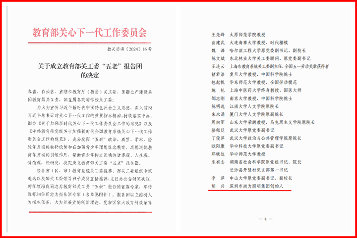 本网讯(记者 苏丽敏 通讯员 张玲)近日,教育部关心下一代工作委员会公布了《关于成立教育部关工委“五老”报告团的决定》,我校关工委、宣传部推荐的知名校友胡兴成功入选。全国仅35人获聘,成员涵盖全国时代楷模,著名院士、专家,模范代表等先进典型。