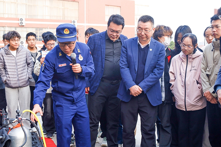 出席领导、参会师生观摩消防器材装备、消防装备特勤器材展示,保卫处副处长张喜增作出讲解。参与师生情绪高涨,积极学习消防安全知识。