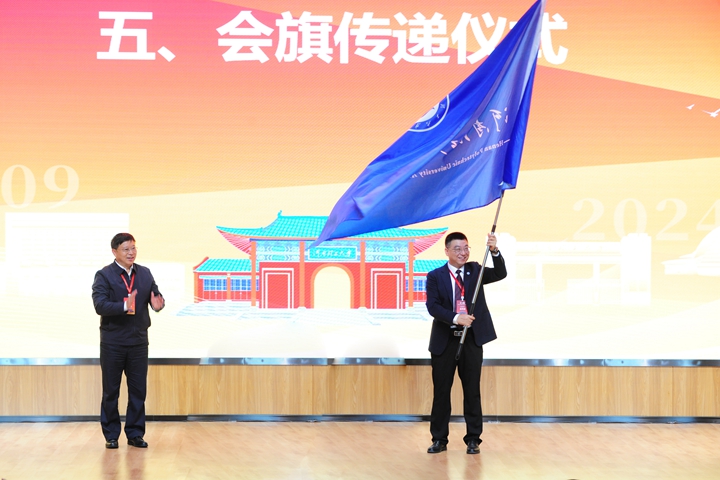 第二任会长杨小林和第三任会长赵同谦进行会旗传递