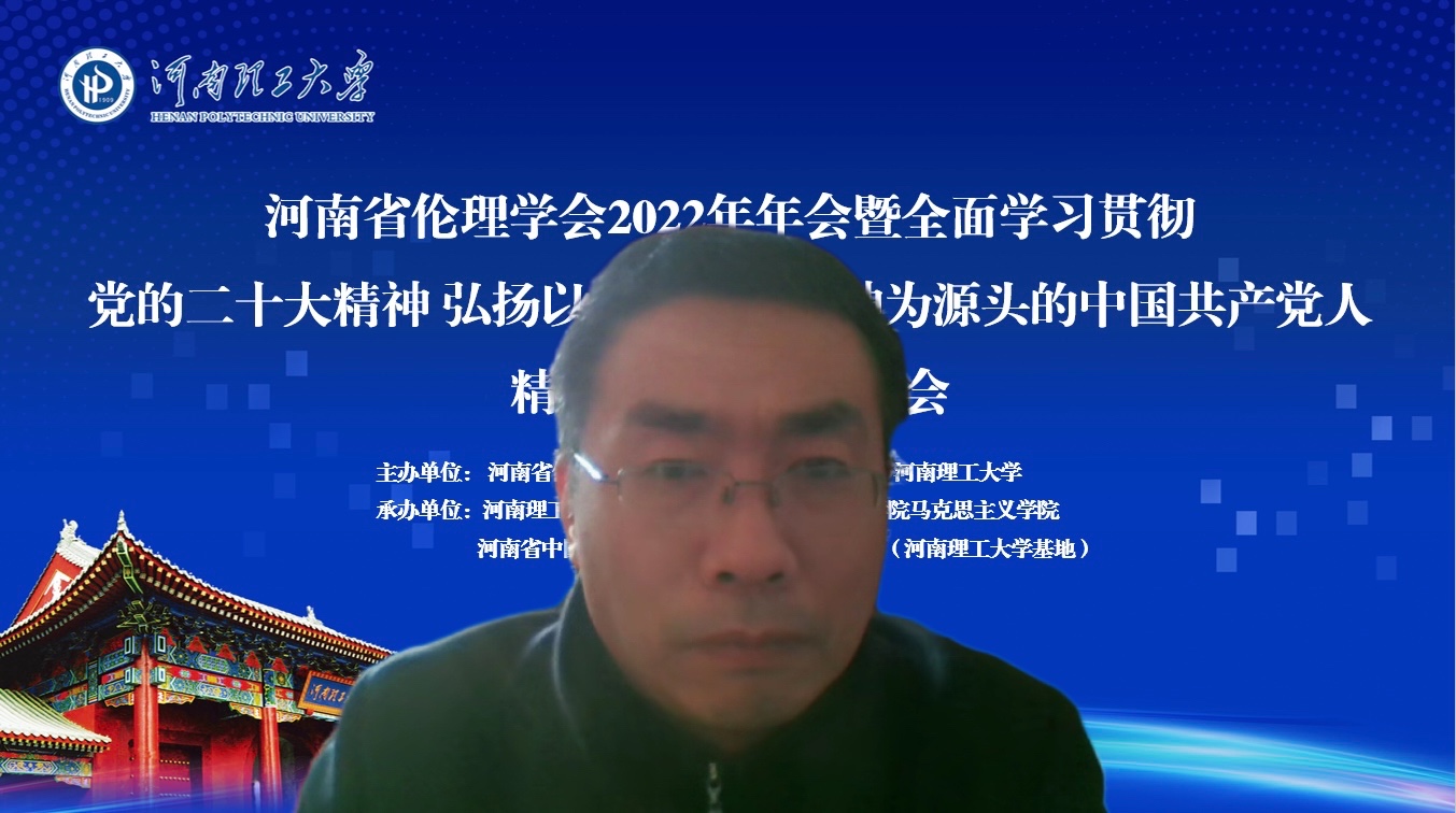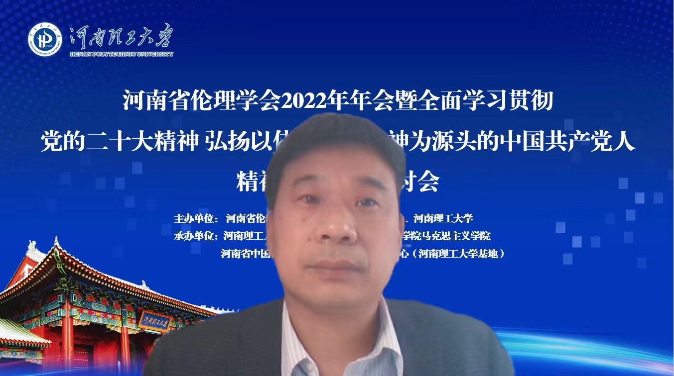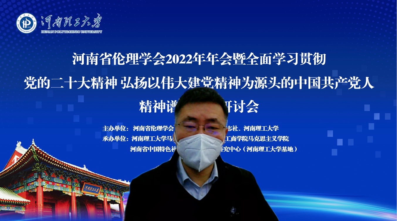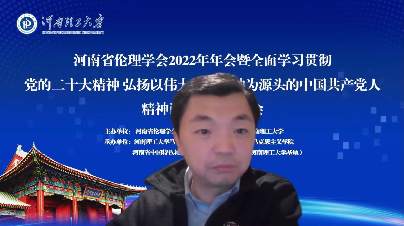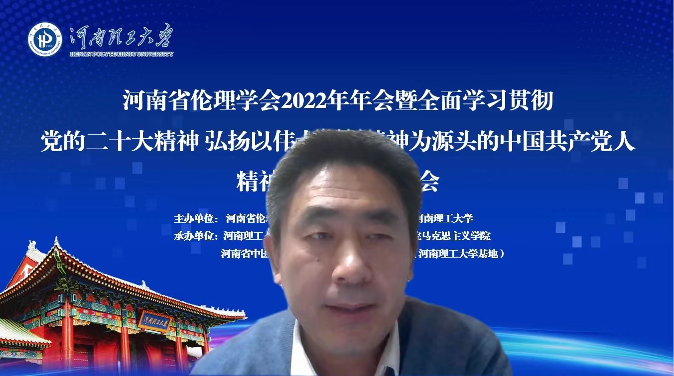 本网讯 12月17日,由河南省伦理学会、《道德与文明》杂志社、河南理工大学主办,河南理工大学马克思主义学院、郑州工商学院马克思主义学院、河南省中国特色社会主义理论体系研究中心(河南理工大学基地)承办的“河南省伦理学会2022年年会暨全面学习贯彻党的二十大精神 弘扬以伟大建党精神为源头的中国共产党人精神谱系学术研讨会”,以“线上线下”相结合的方式隆重举行。