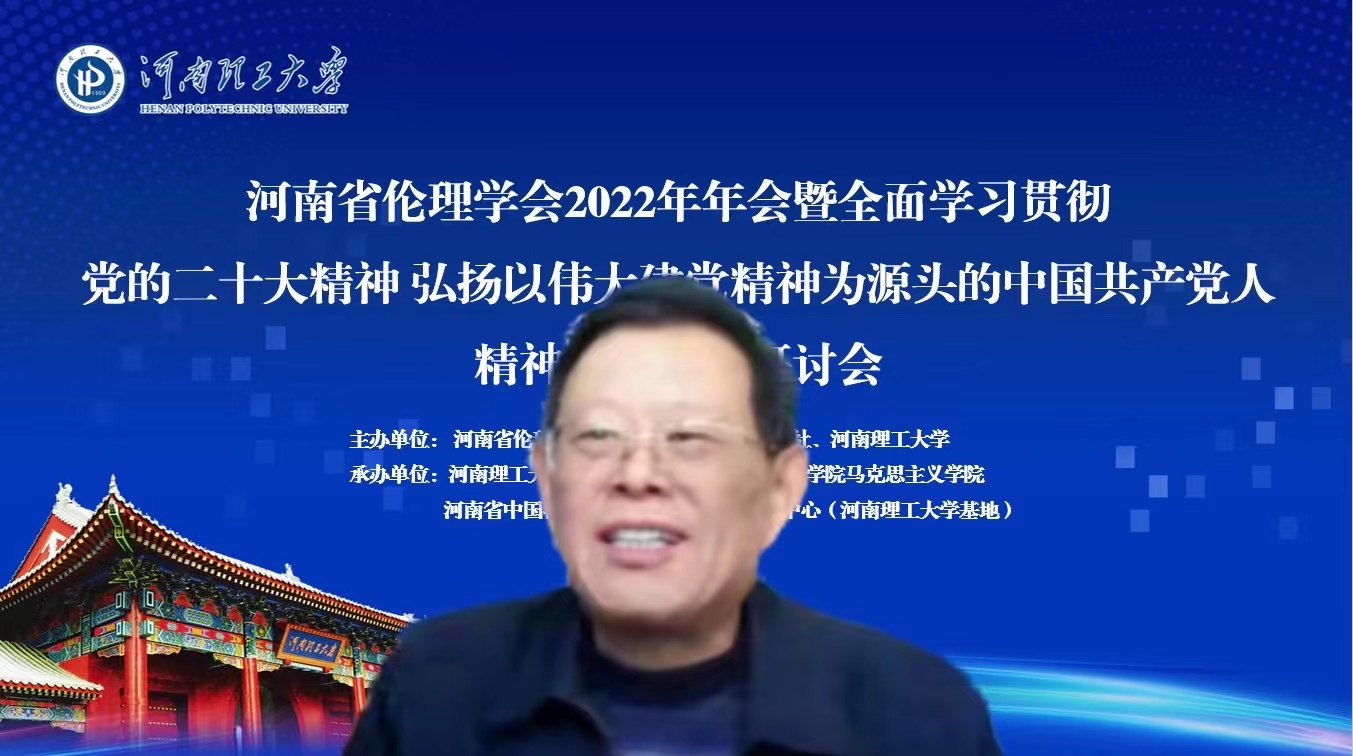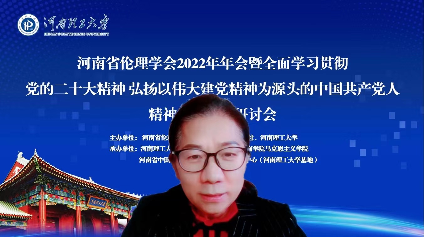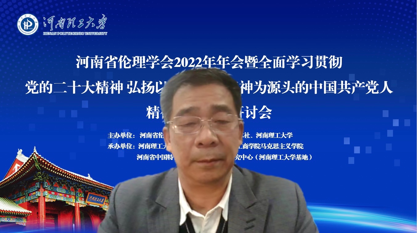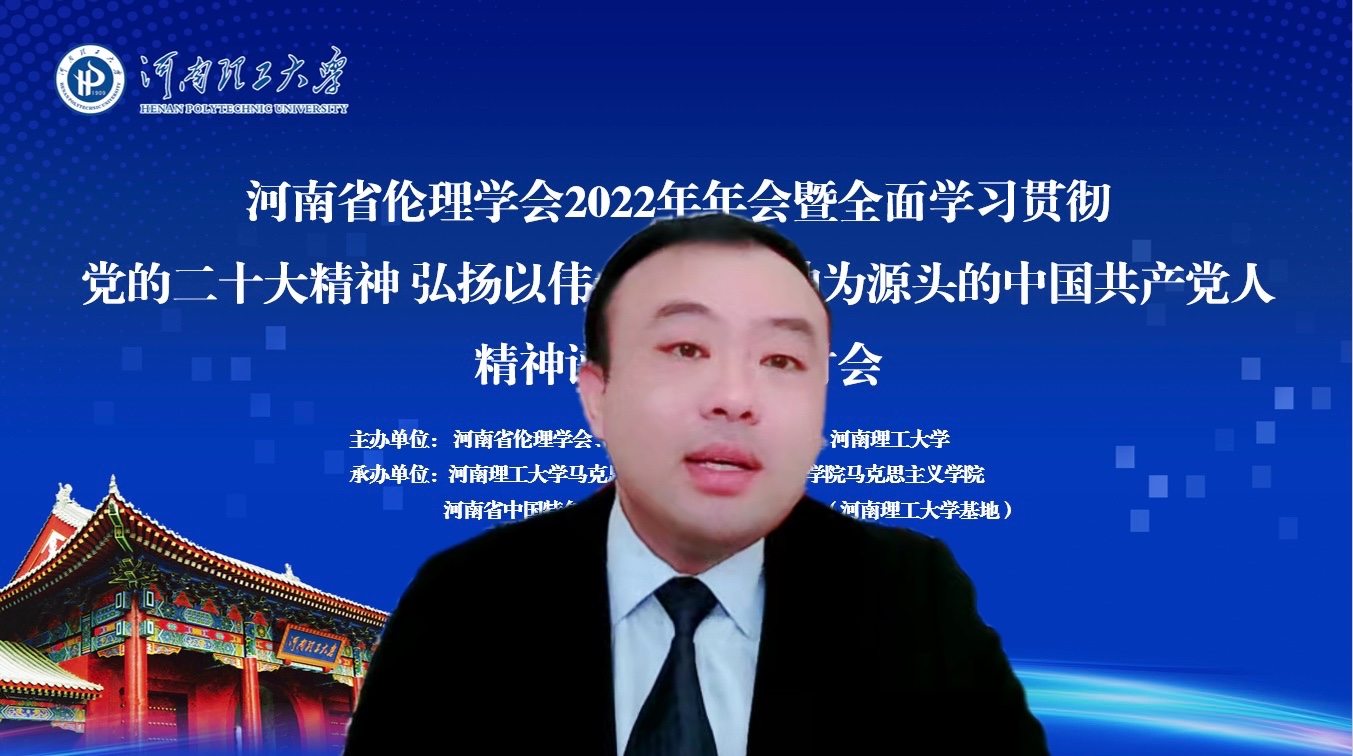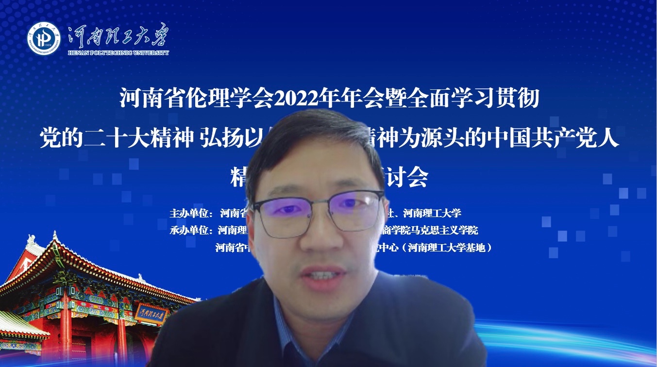 本网讯 12月17日,由河南省伦理学会、《道德与文明》杂志社、河南理工大学主办,河南理工大学马克思主义学院、郑州工商学院马克思主义学院、河南省中国特色社会主义理论体系研究中心(河南理工大学基地)承办的“河南省伦理学会2022年年会暨全面学习贯彻党的二十大精神 弘扬以伟大建党精神为源头的中国共产党人精神谱系学术研讨会”,以“线上线下”相结合的方式隆重举行。