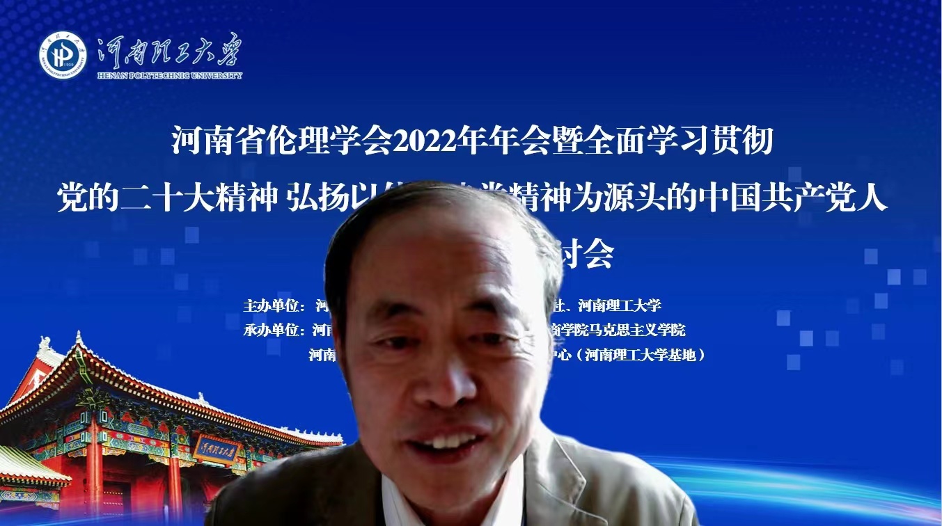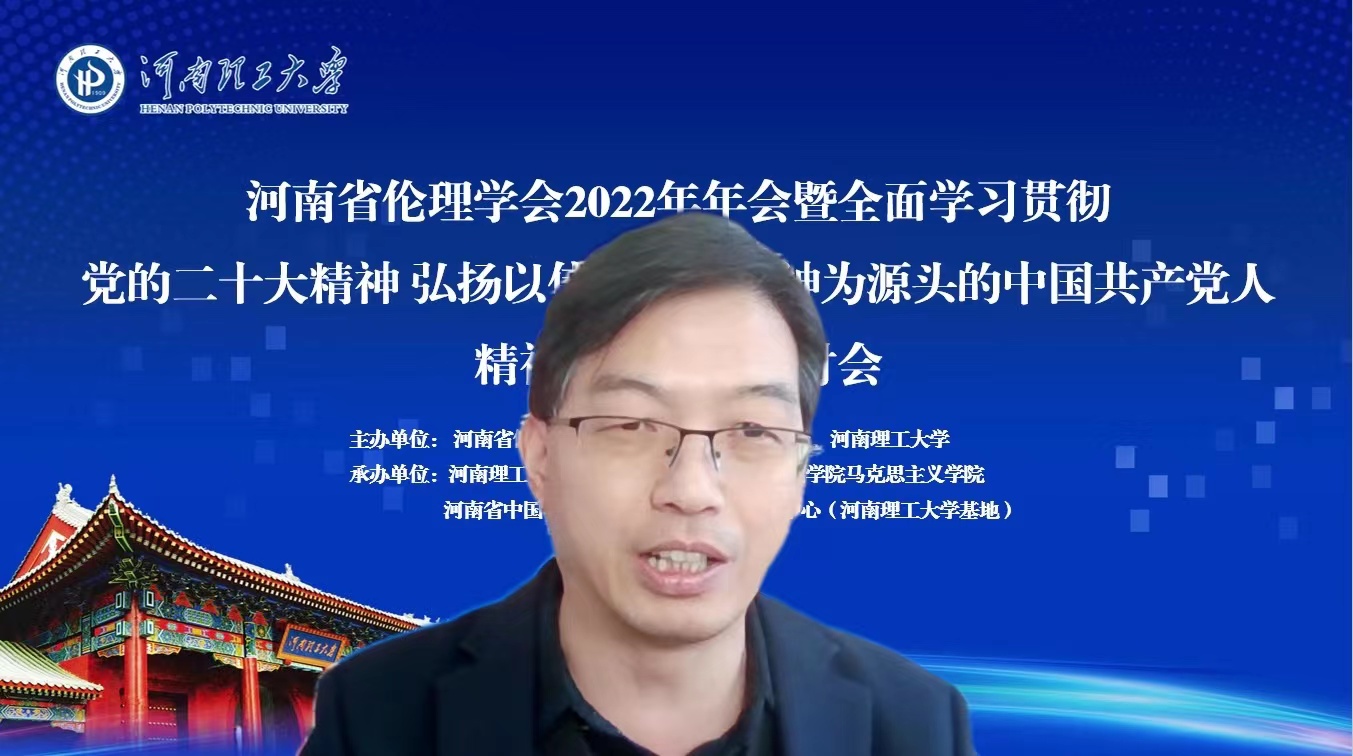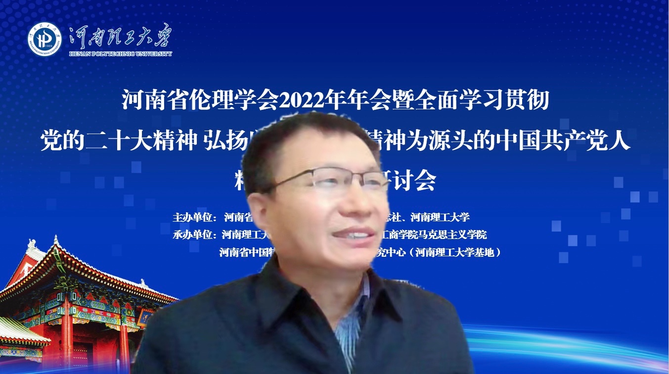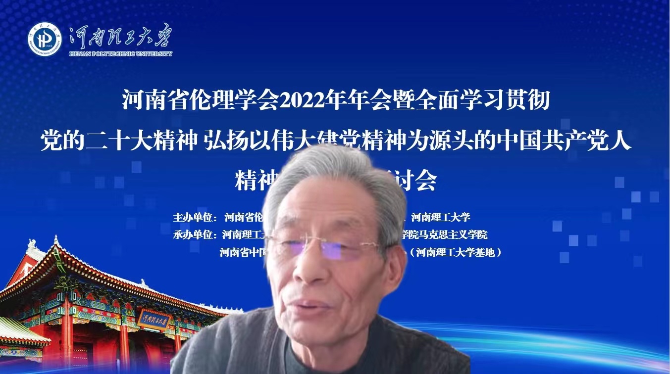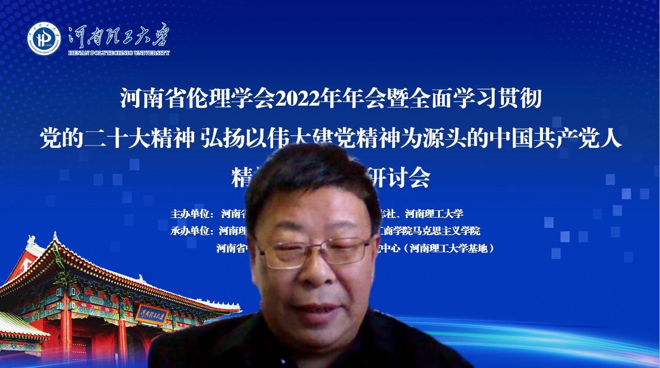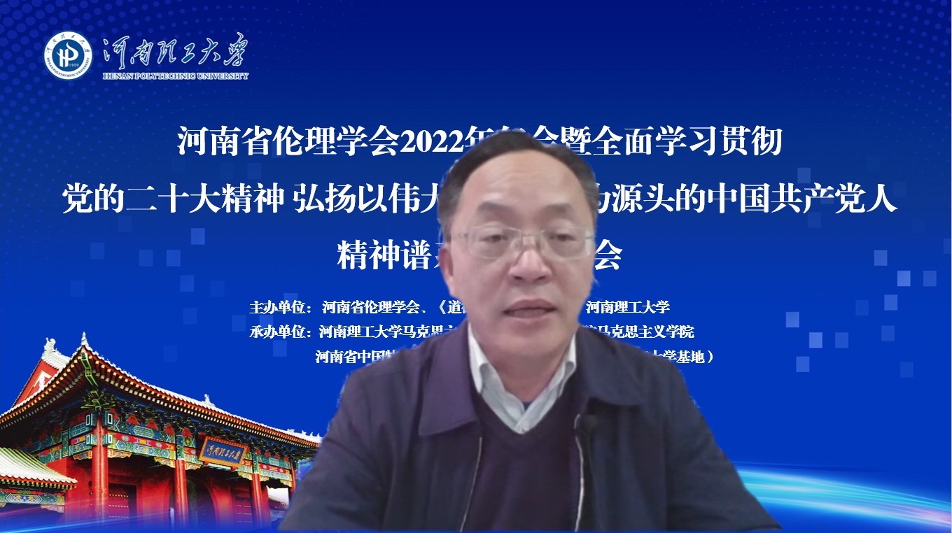 本网讯 12月17日,由河南省伦理学会、《道德与文明》杂志社、河南理工大学主办,河南理工大学马克思主义学院、郑州工商学院马克思主义学院、河南省中国特色社会主义理论体系研究中心(河南理工大学基地)承办的“河南省伦理学会2022年年会暨全面学习贯彻党的二十大精神 弘扬以伟大建党精神为源头的中国共产党人精神谱系学术研讨会”,以“线上线下”相结合的方式隆重举行。